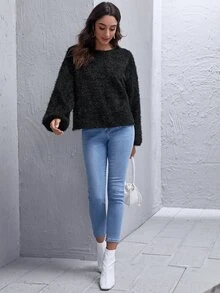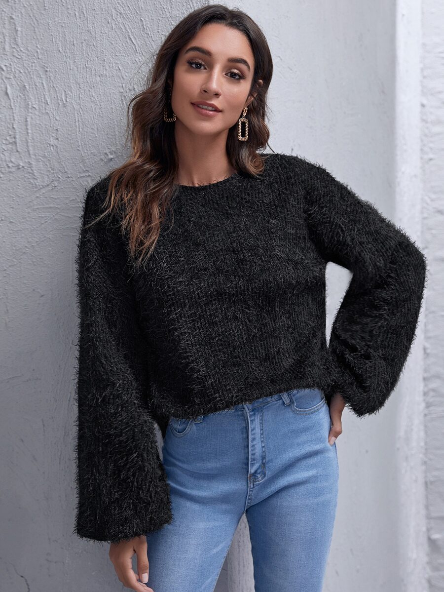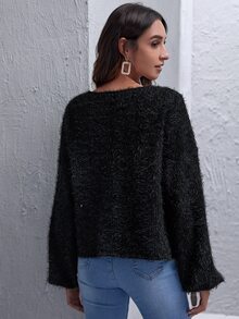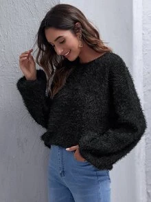 Drop Shoulder Lantern Sleeve Fluffy Knit Sweater