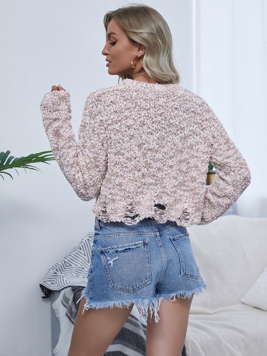 Drop Shoulder Ripped Popcorn Knit Sweater