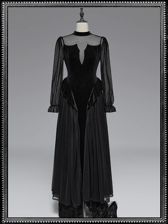 EDITION Black Long Sleeve Ruffle Lace-Up Mesh Gothic Style Dress For Women, Halloween