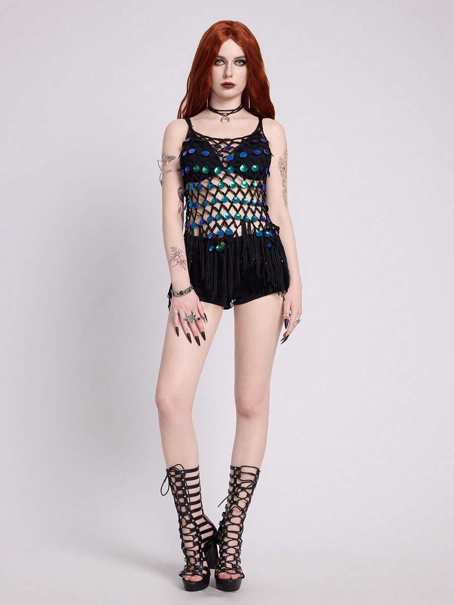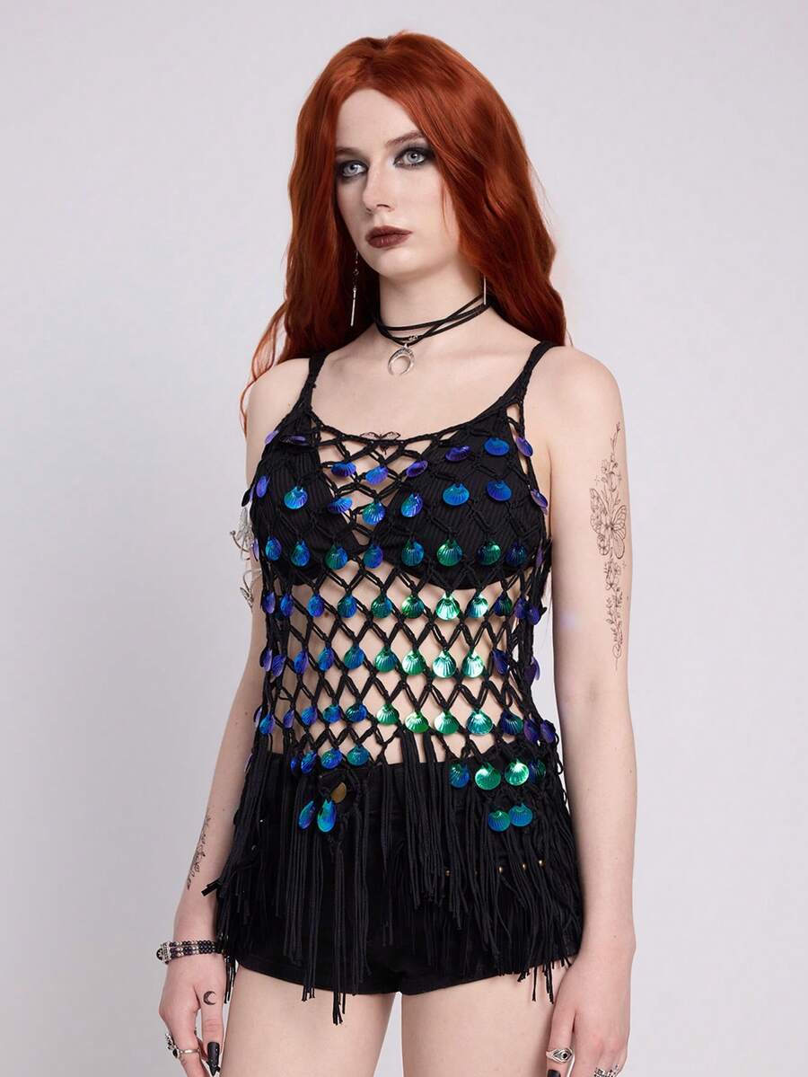 EDITION Summer Beach Gothic Style Shell Rhinestone Hollow Out Lightweight Cardigan Tank Top For Women
