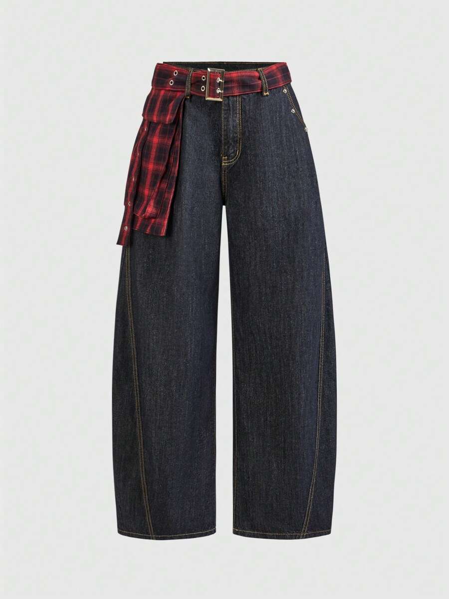 EDITION Y2K Retro American Style Plaid Skirt Hem Layered Flared Leg Jeans