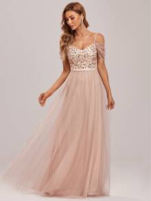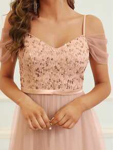 EVERPRETTY Contrast Sequin Cold Shoulder Backless Mesh Hem Prom Dress