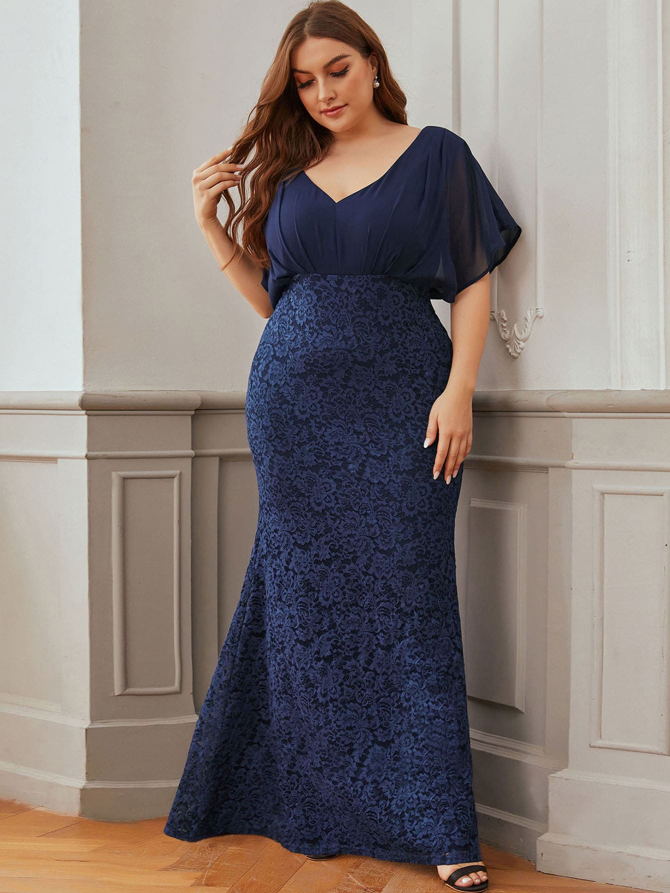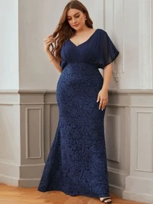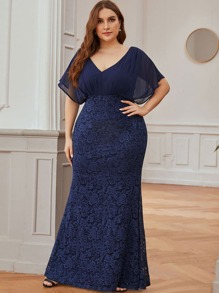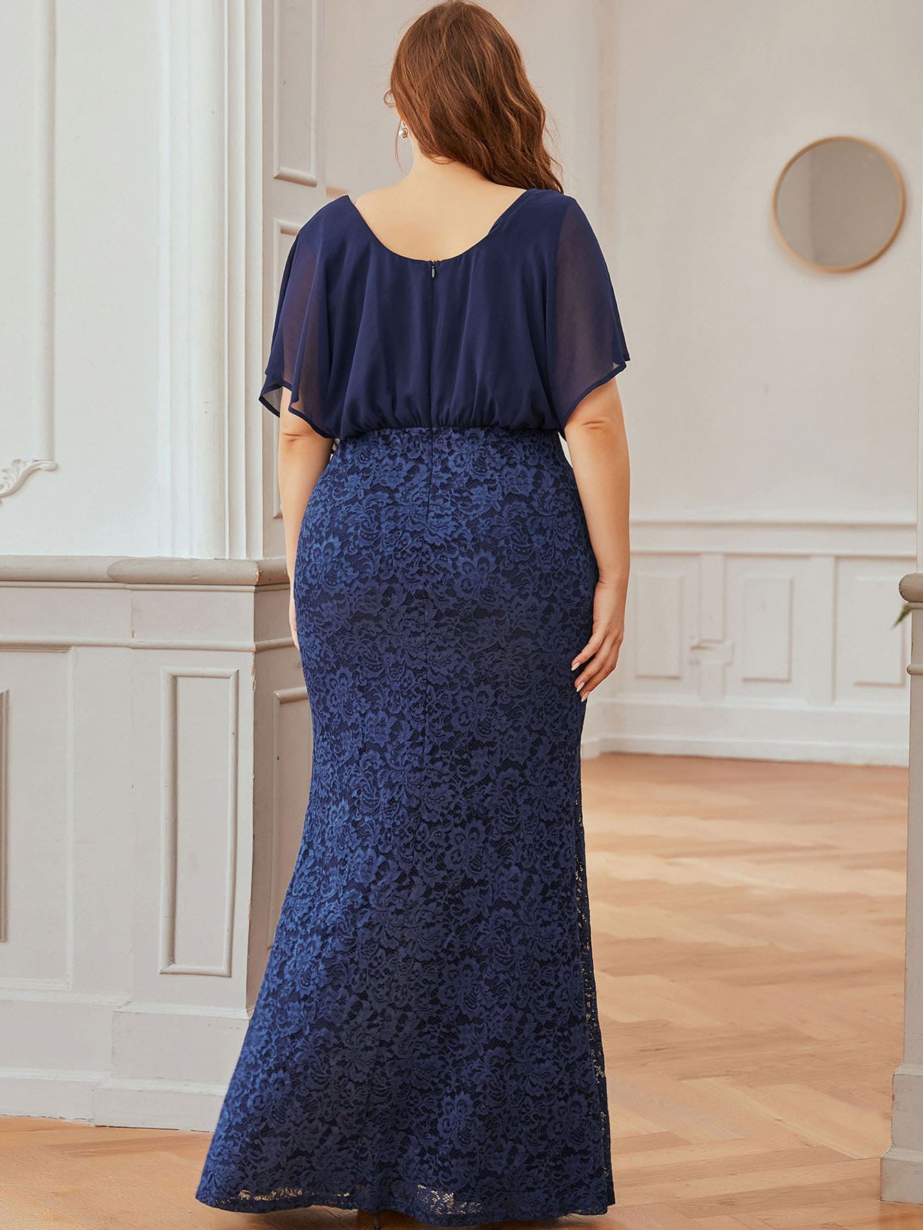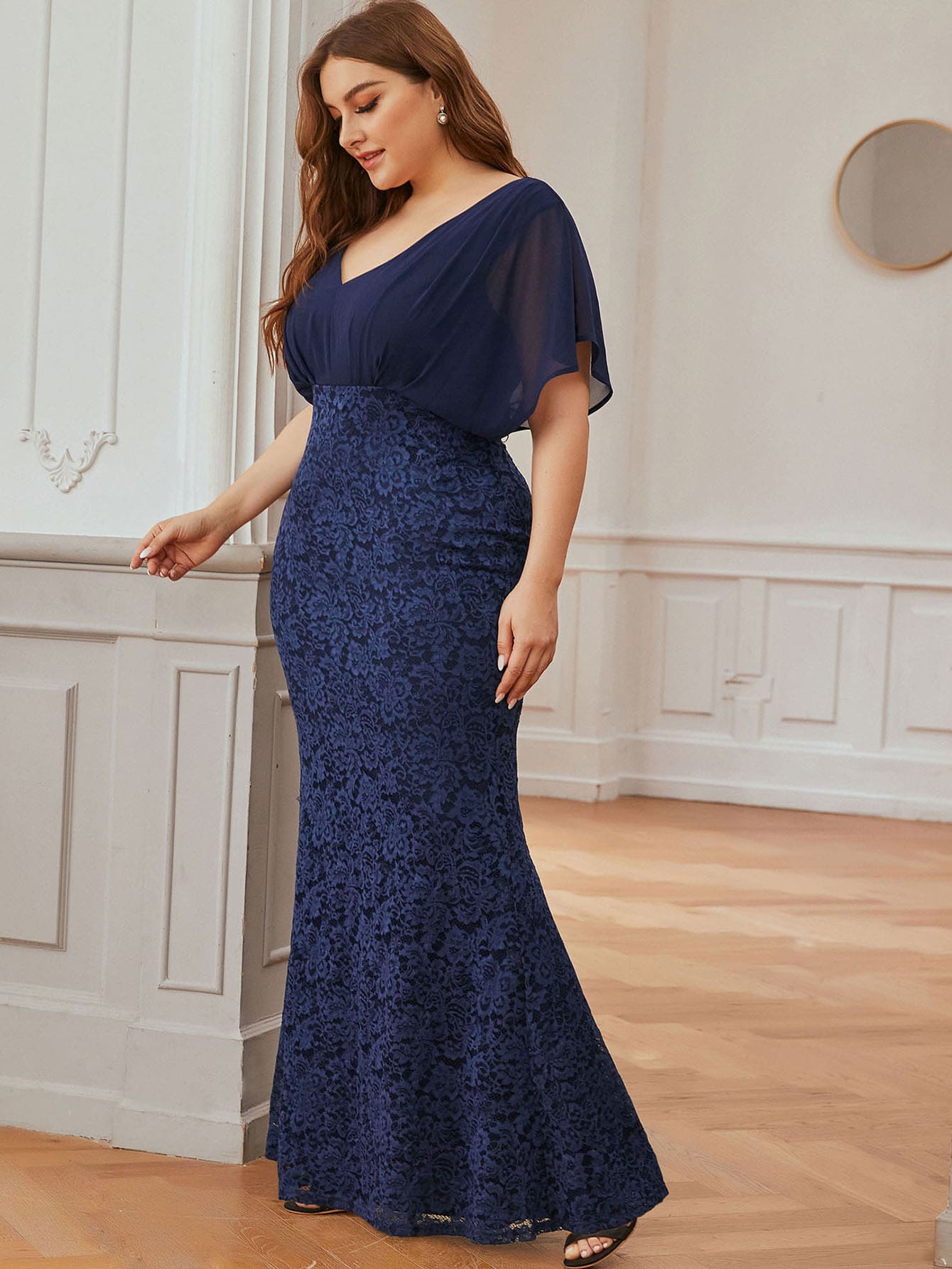 EVERPRETTY Plus Batwing Sleeve Ruched Floral Lace Prom Dress