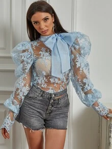 Eilly Bazar Big Bow Sheer Embroidered Mesh Top Without Bandeau