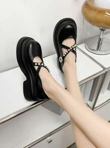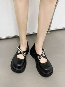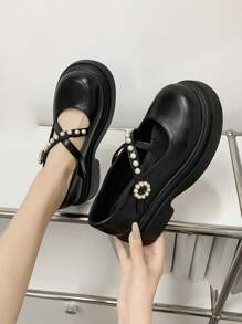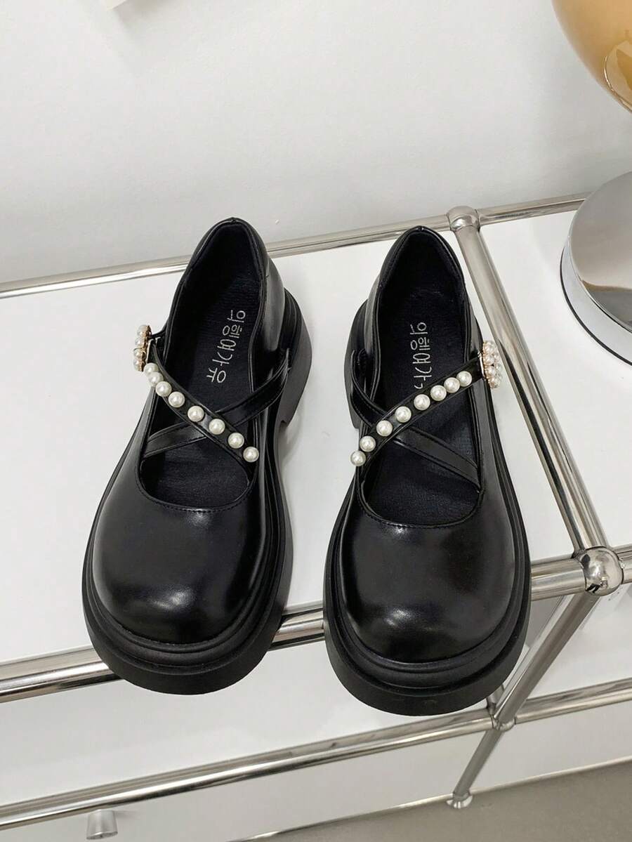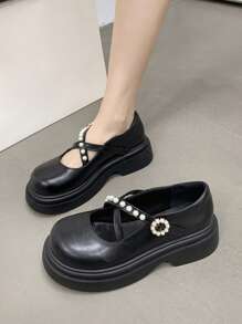 Elegant Mary Jane Shoes Women Faux Pearl Decor Platform Wedges Shoes