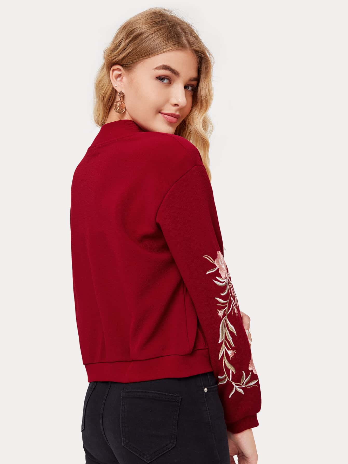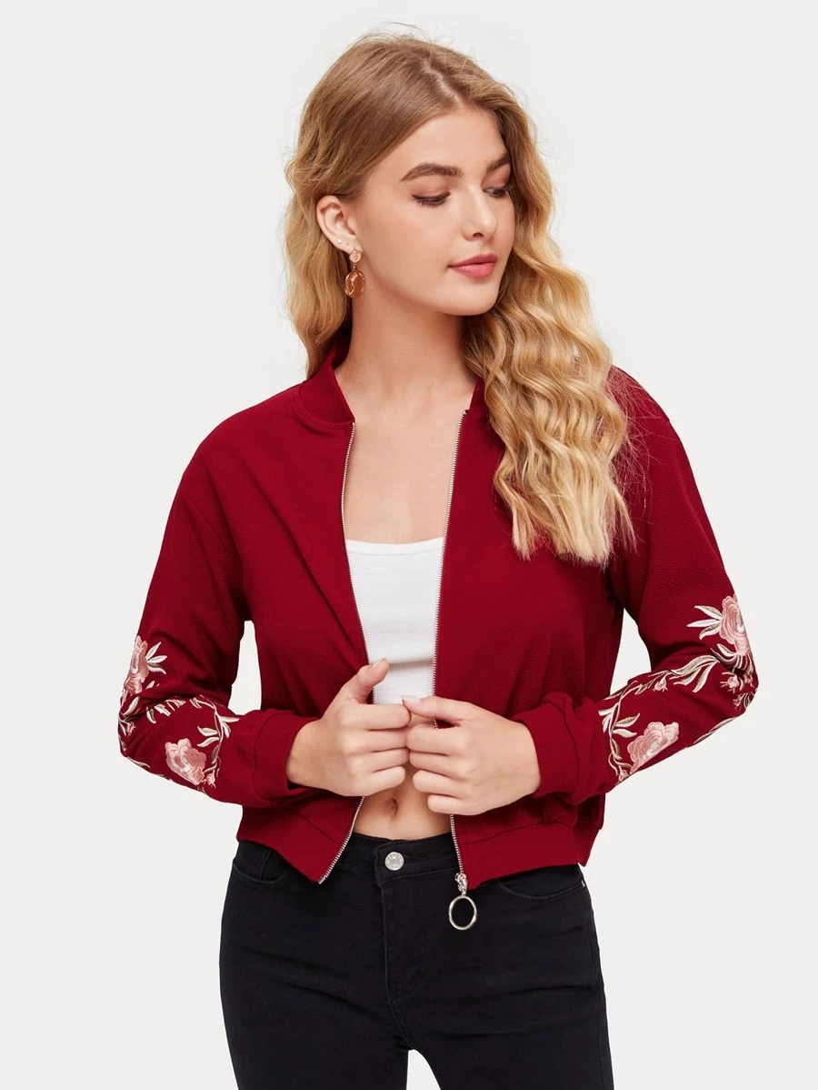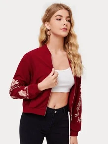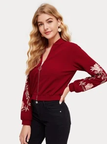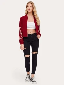 Embroidered Floral Detail O-ring Zip Up Bomber Jacket