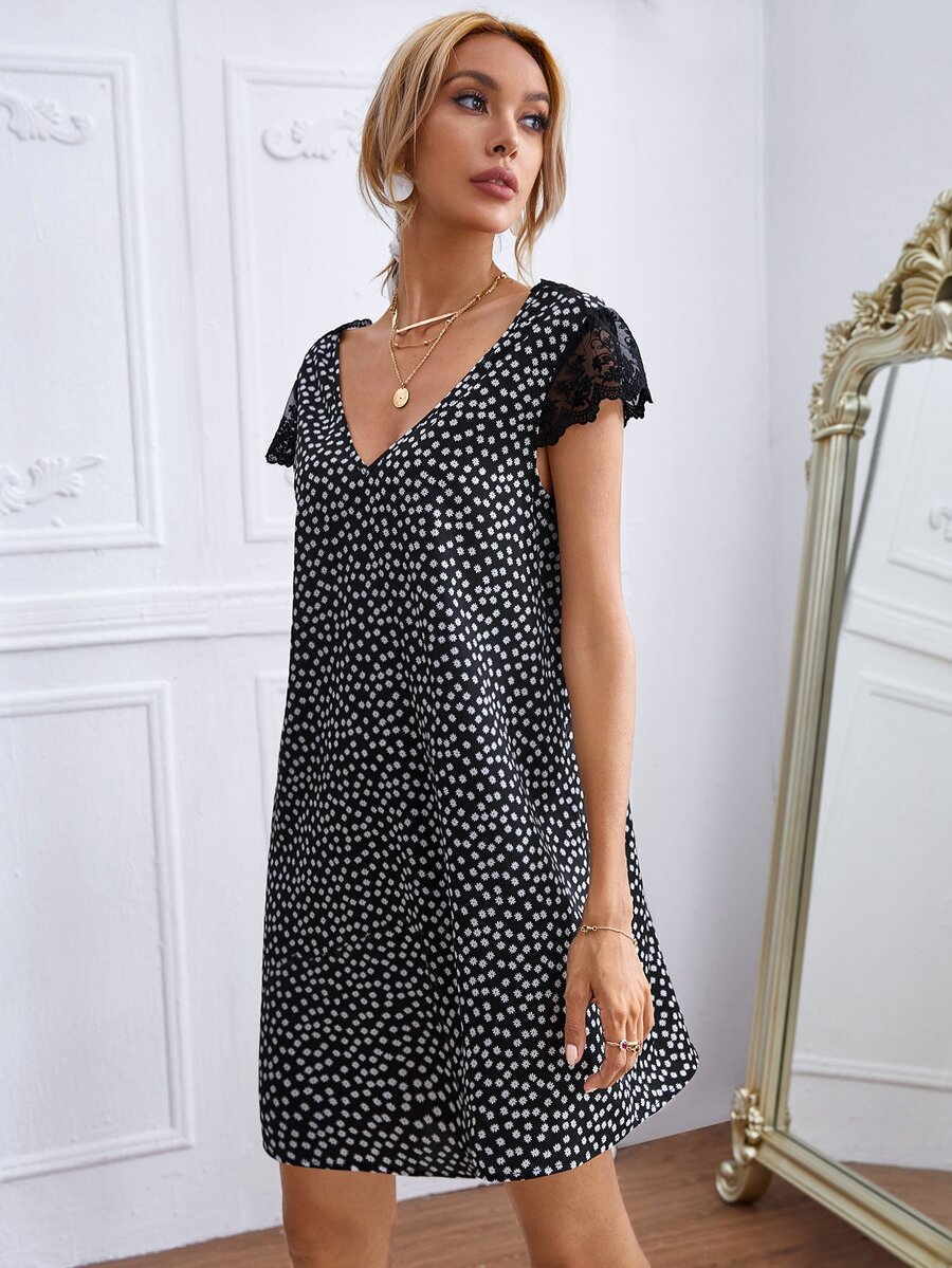 Embroidered Mesh Insert Ditsy Floral Dress