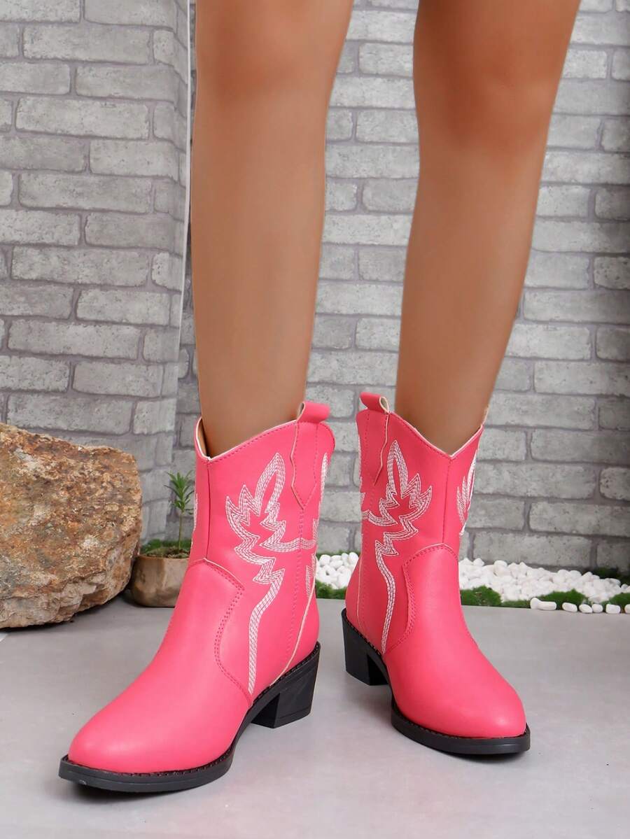European And American Western Style Women's Retro Pink Cowboy Boots, Pointed Toe Chunky Heel Mid-Calf Short Booties
