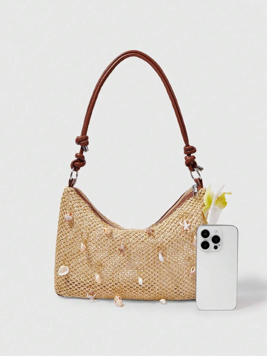 Fairycore 1 Piece Brown Seashell & Starfish Woven Beach Bag With Accessories, Personalized Fashion Beach Style Women Shoulder Bag (Includes 1 Bag And 1 Set Of Accessories)
