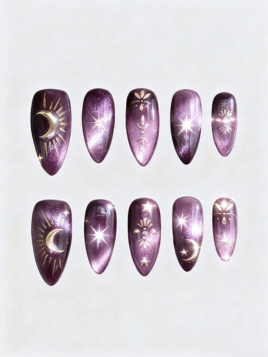 Fairycore 10pcs Sun, Moon & Star Handmade False Nails + 3 Sheets Double-Sided Adhesive, Removable Purple Ombre Painted Nail Art Stickers, High-Quality Shiny Colored Cat Eye Nail Decals, Suitable For Holidays, Parties, Dancing & Daily Wear