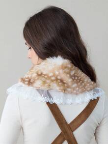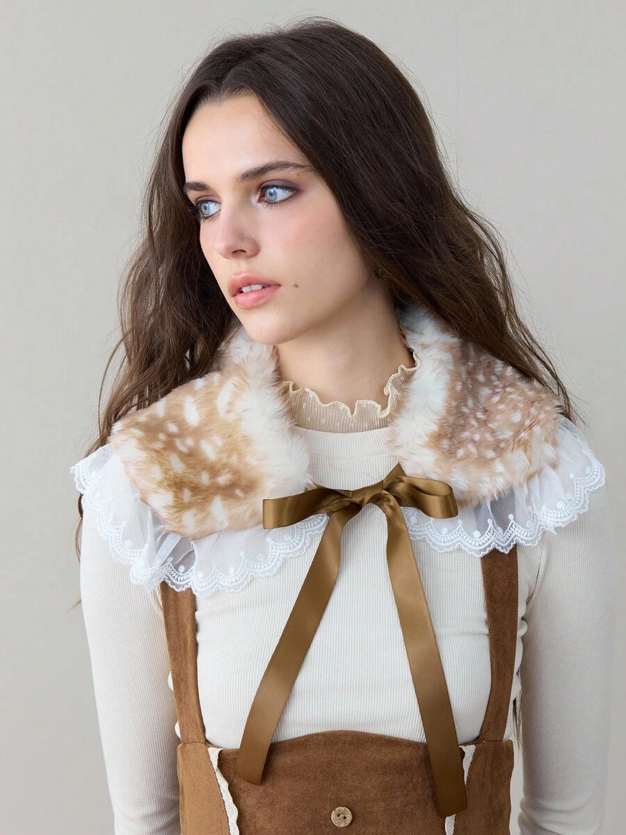 Fairycore 1pc Adorable Deer Design Plush Shawl, Sweet Lace Ruffle Bowknot Scarf, Warm Fashion Neck Accessories For Autumn/Winter