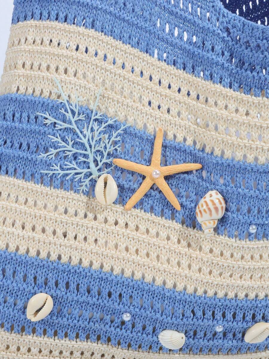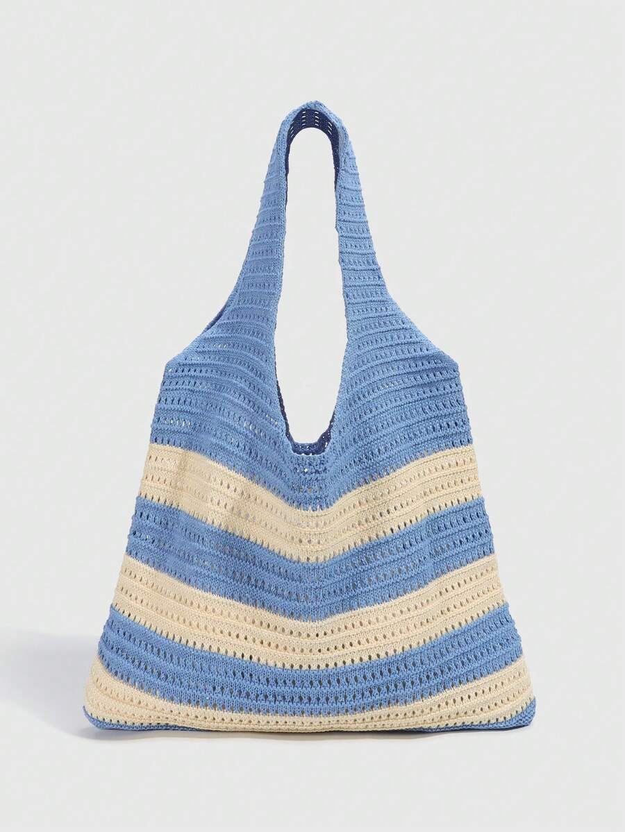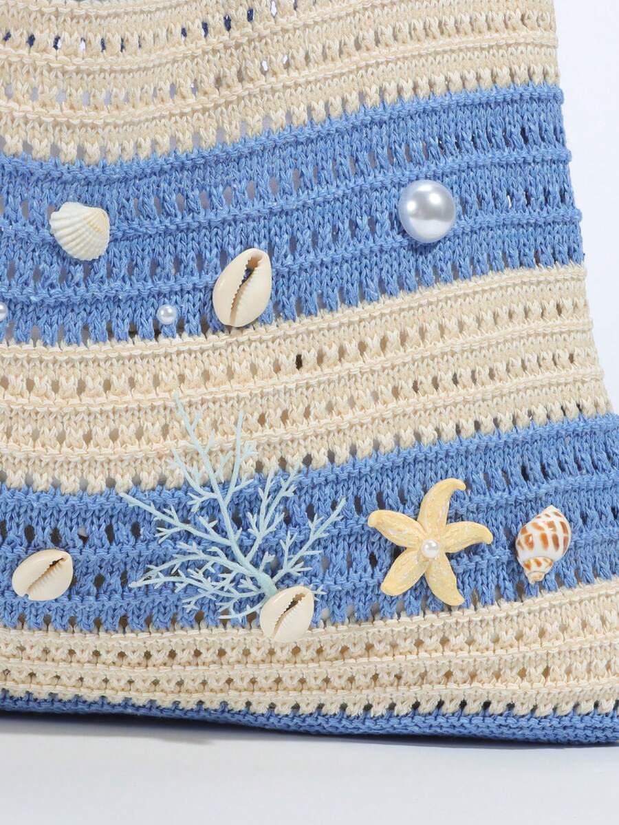 Fairycore 1pc Beach Style Color Block Blue Stripe Knit Tote Handbag, Shell & Starfish Decor Women Shoulder Bag