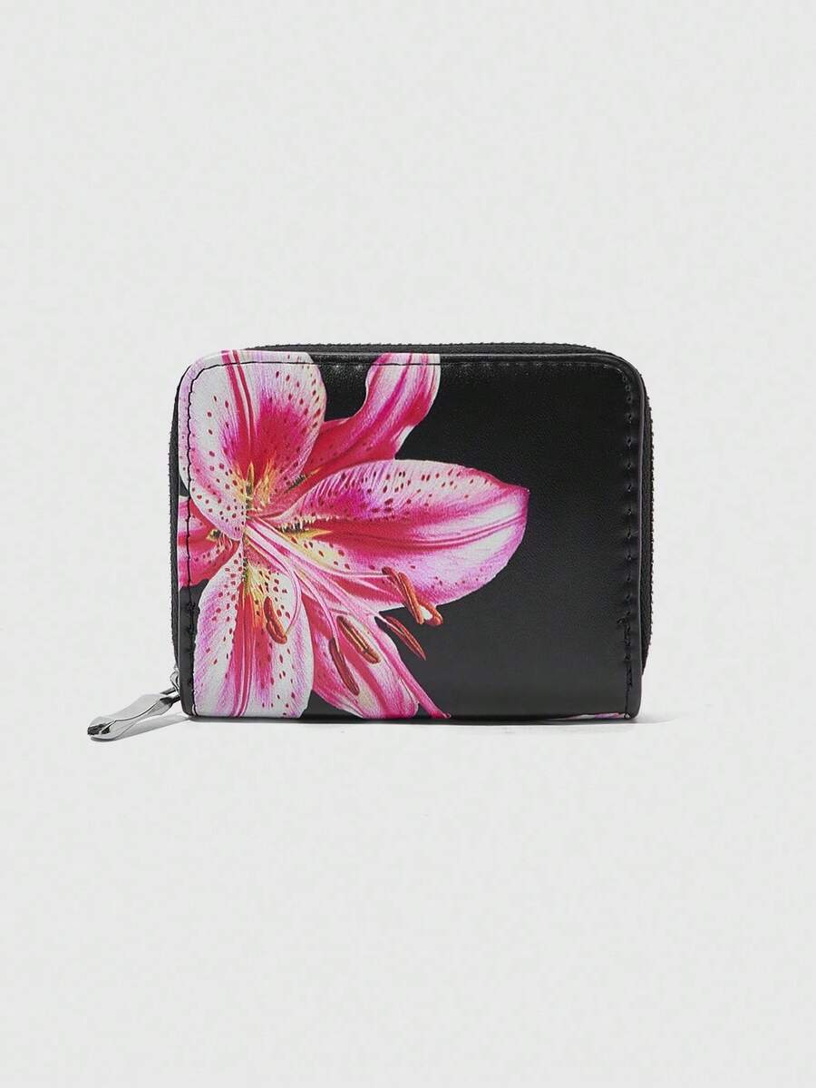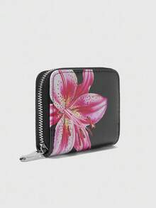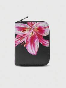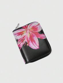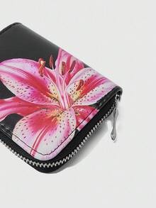 Fairycore 1pc Black Floral Short Wallet, Minimalist Zipper Coin Purse For Women