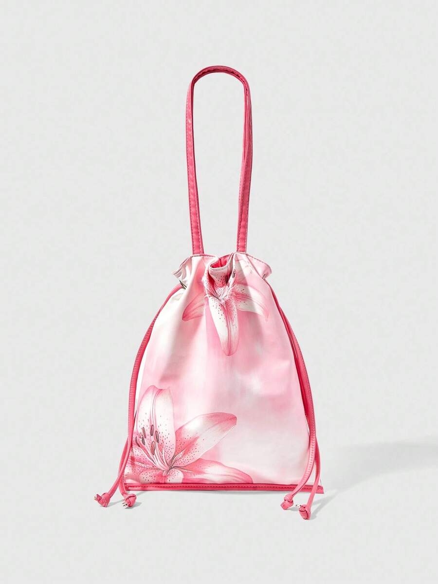 Fairycore 1pc Pink Lily Flower Design Drawstring PU Tote Bag, Versatile Fashion Shoulder Bag, Suitable For Shopping, Party, School, Commute