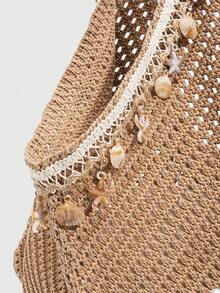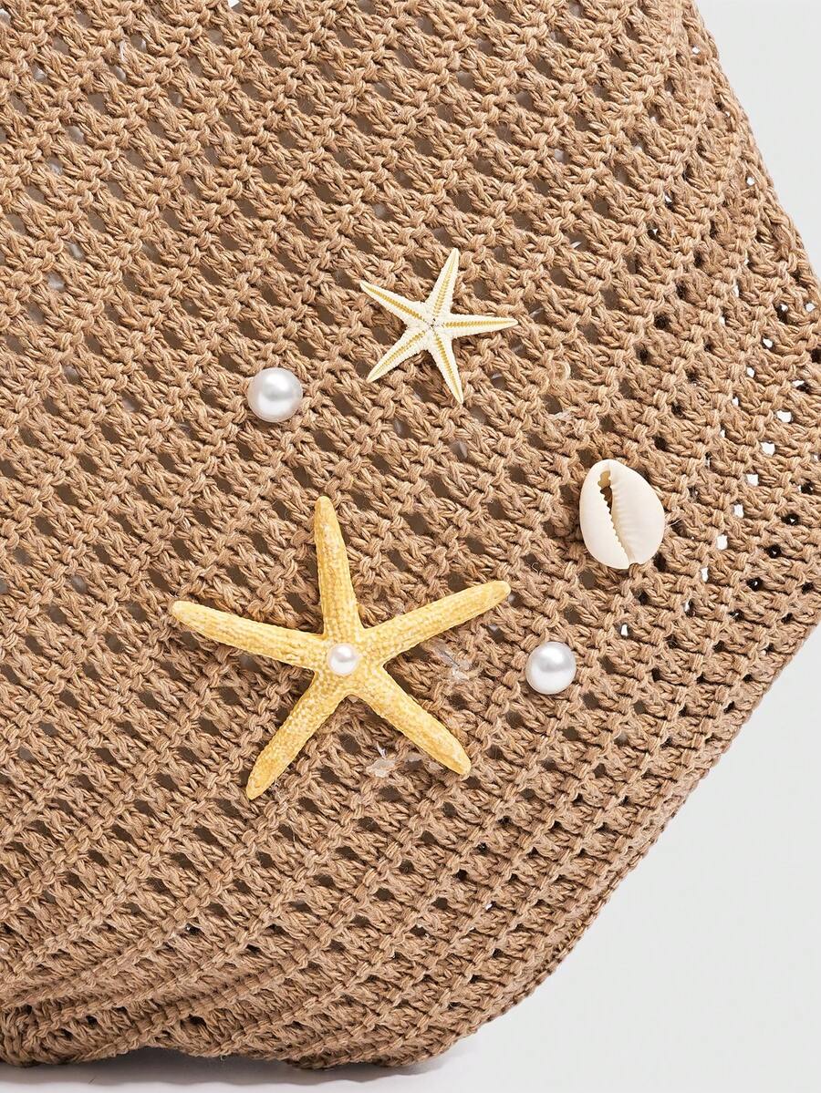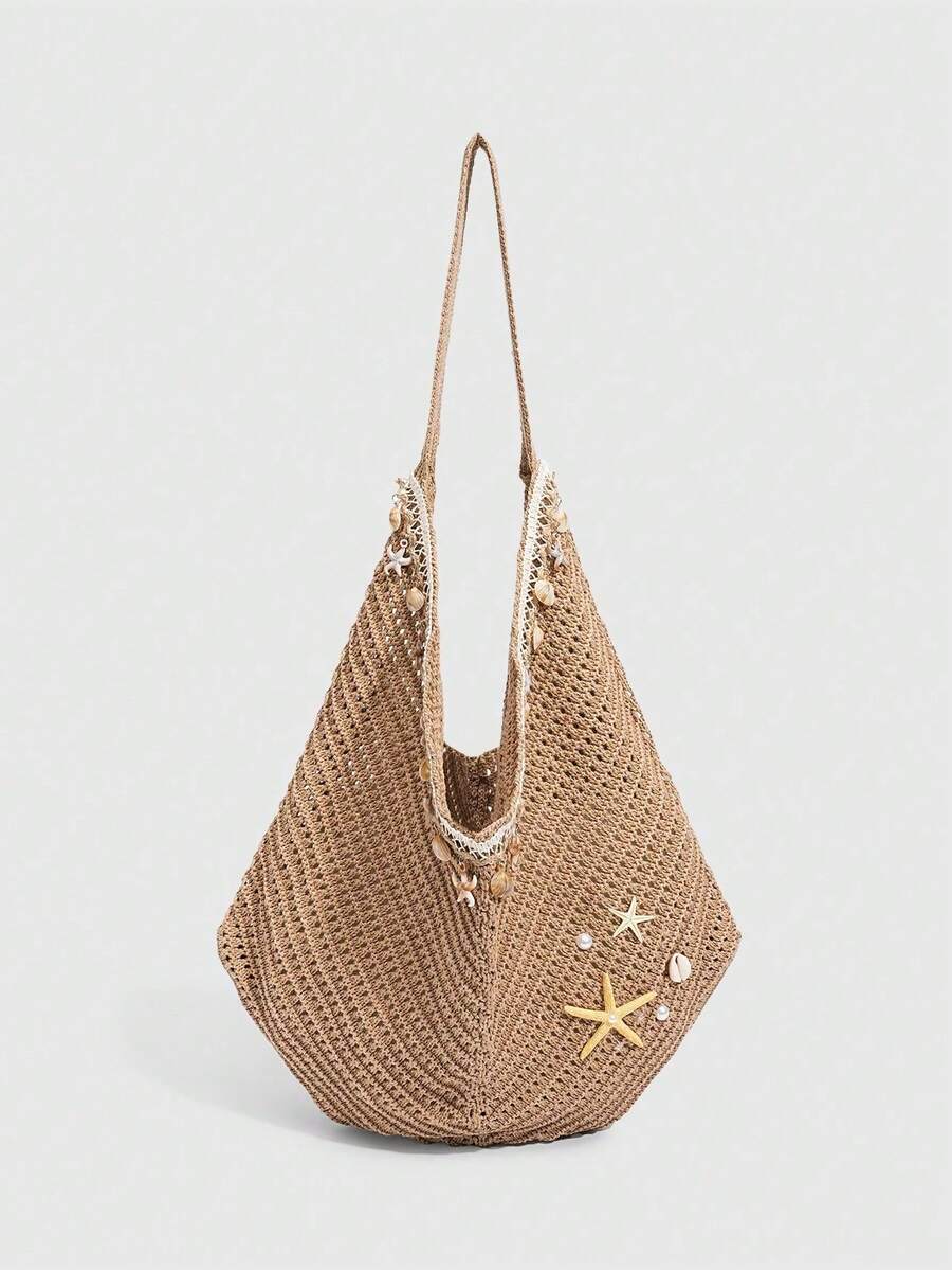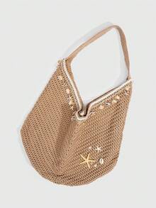 Fairycore 1pc Tropical Ocean Beach Resort Style Woven Hollow Khaki Women Shoulder Tote Bag, Large Capacity