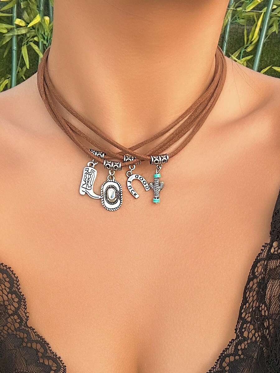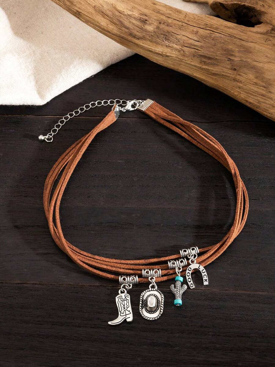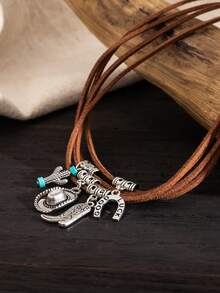 Fairycore 1pc Vintage Bohemian Western Cowboy Style Cactus & Cowboy Hat Decorated Multi-Layered Necklace