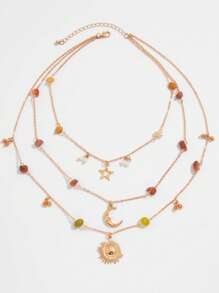 Fairycore 1pc Women's Boho Multilayer Asymmetrical Beaded Sun Pendant Necklace