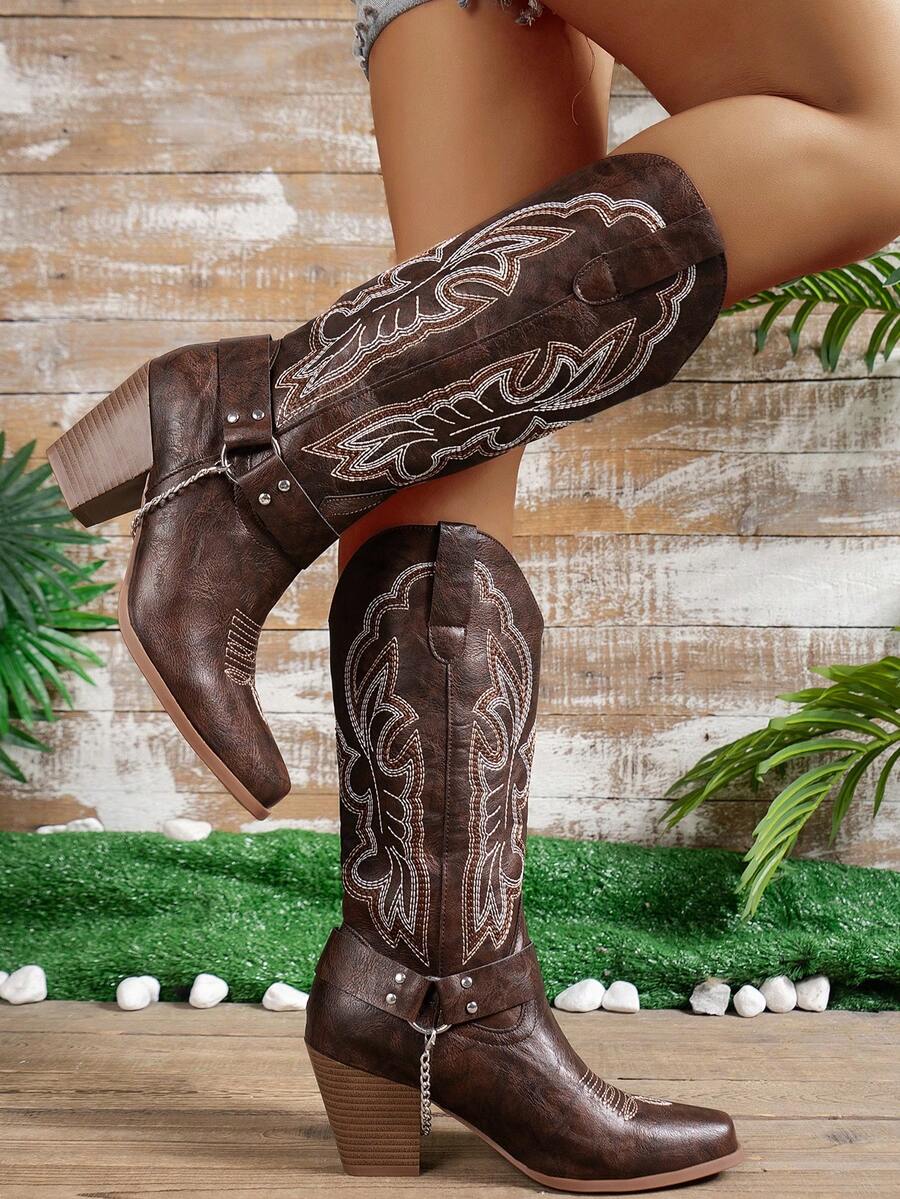Fairycore 2024 New Collection Women's Coffee Brown Embroidered Buckle Strap Chain Western Boots, Outdoor Fashion Mid-Calf Slip-On Boots, Mori Style