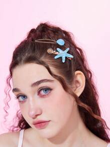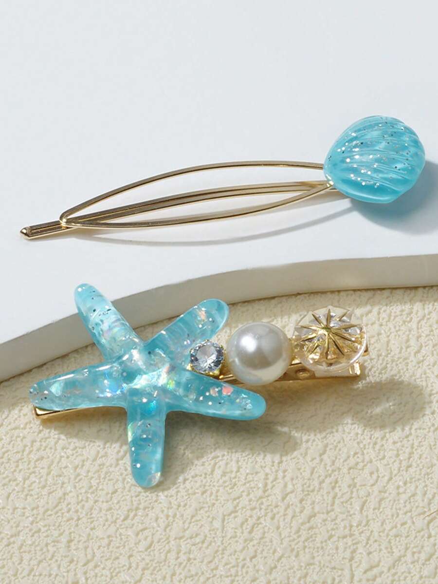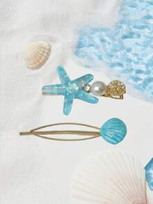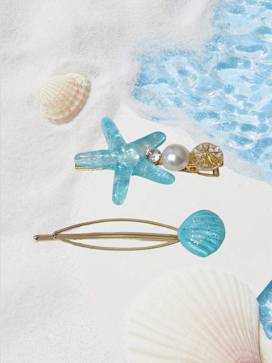 Fairycore 2pcs Women Starfish & Shell Decor Iron Alloy Hair Clip