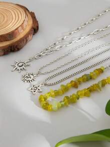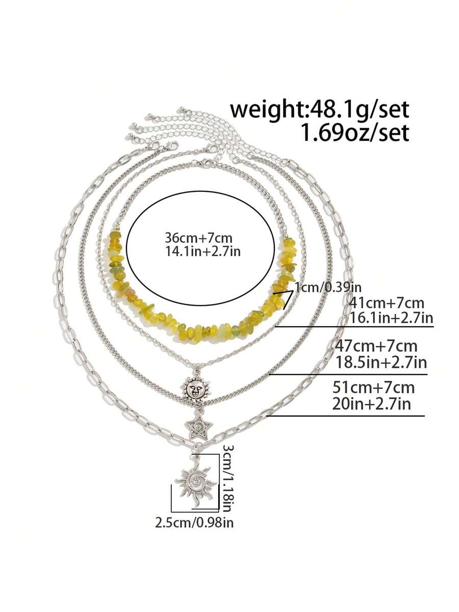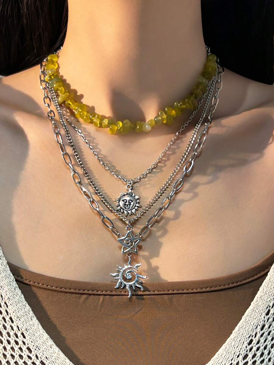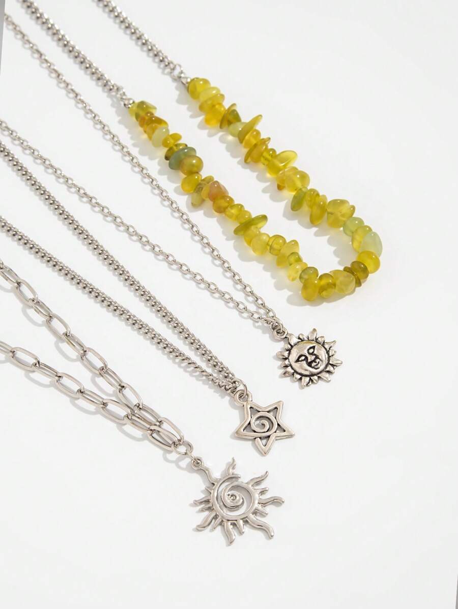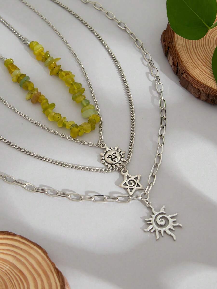 Fairycore 4pcs/Set Fashionable Hippie Minimalist Spiral Sun & Star Crystal Beaded Pendant Necklace Set