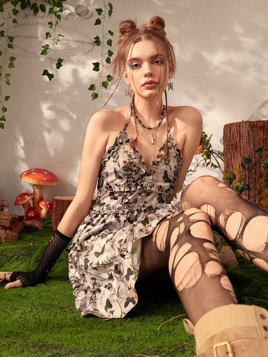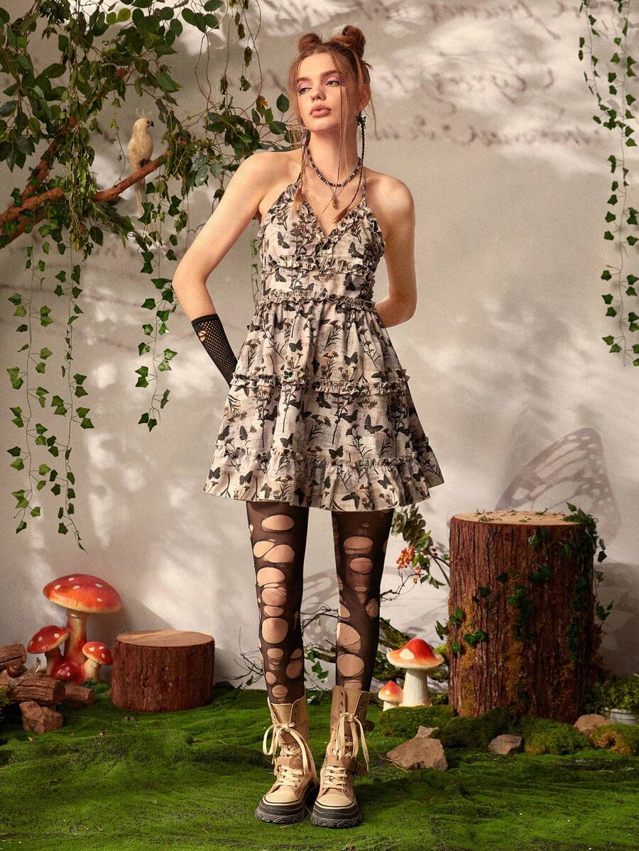 Fairycore Allover Butterfly Print Frill Trim Tie Backless Halter Dress