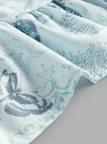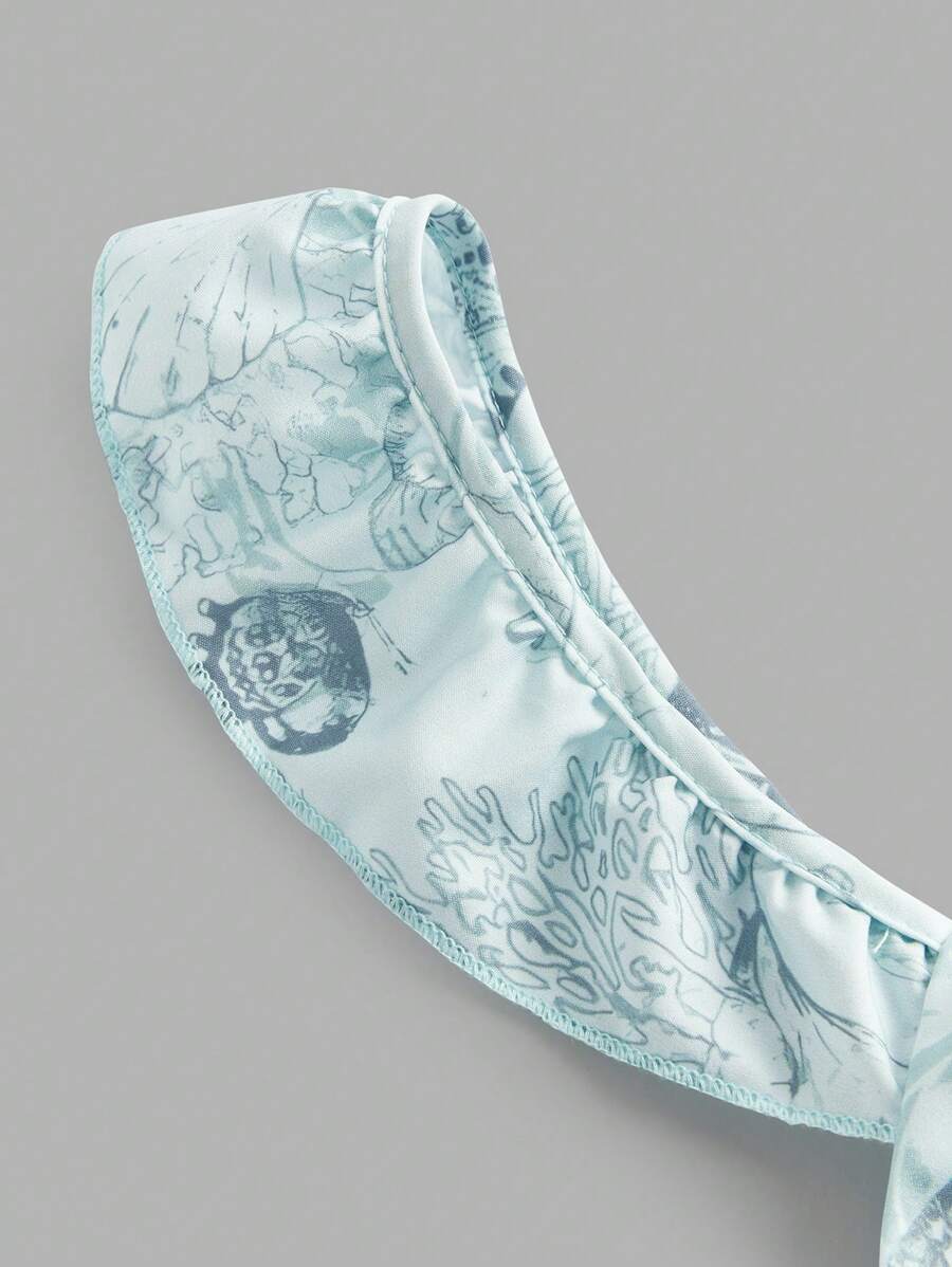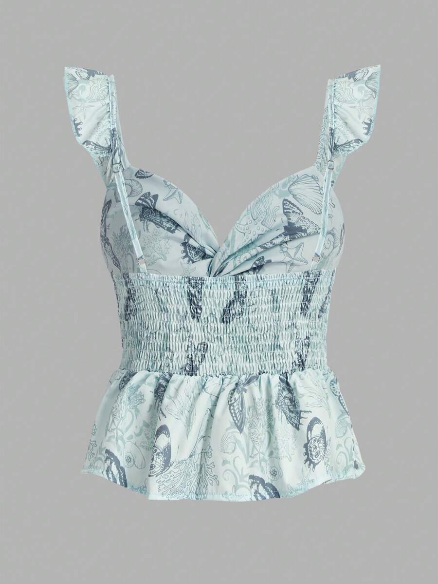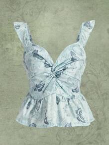 Fairycore Allover Print Twist Front Ruffle Trim Peplum Blouse