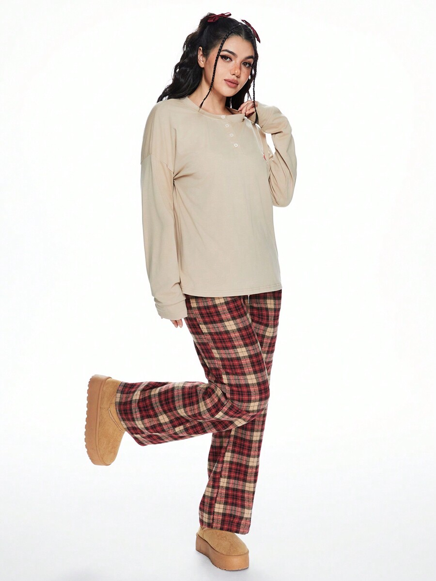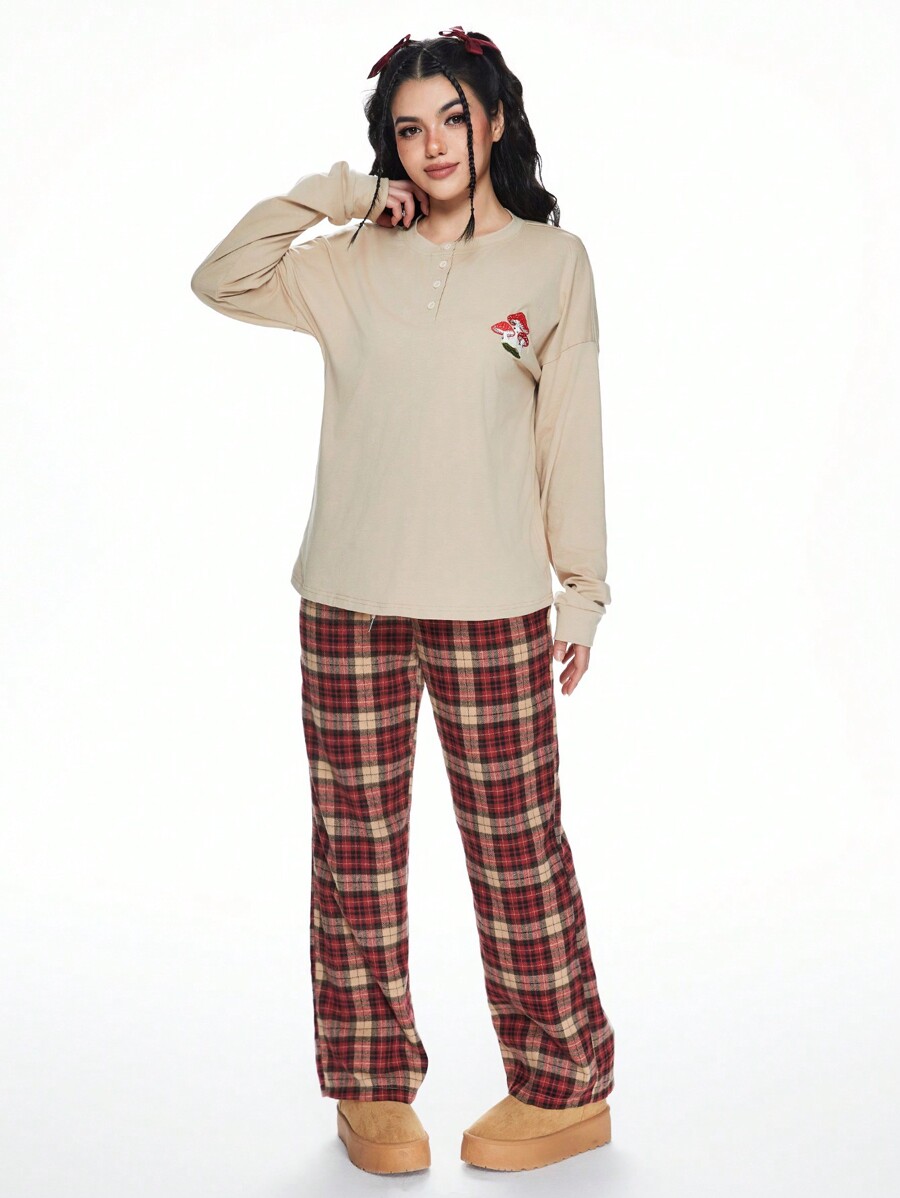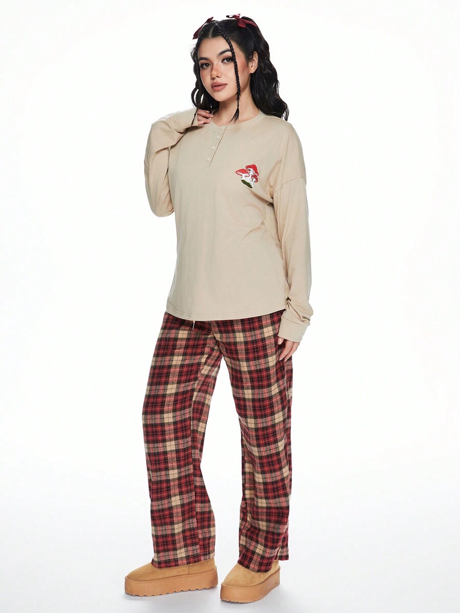 Fairycore Countryside Mushroom Embroidered Long Sleeve Plaid Pajama Set, Casual Sleepwear For Autumn