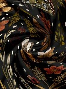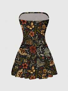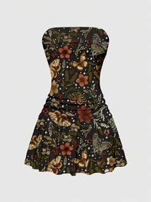 Fairycore Dark Mori Style Butterfly & Leaf Print Sexy Bodycon Low Waist Ruched A-Line Dress For Women, Autumn/Winter