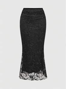 Fairycore Elegant Vintage Lady Solid Black Sequin Ruched Wrap Mermaid Skirt