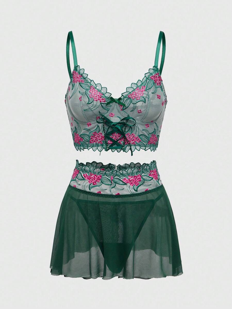 Fairycore Fairy Embroidered Floral Lace-Up Underwire Sexy Lingerie Set For Women