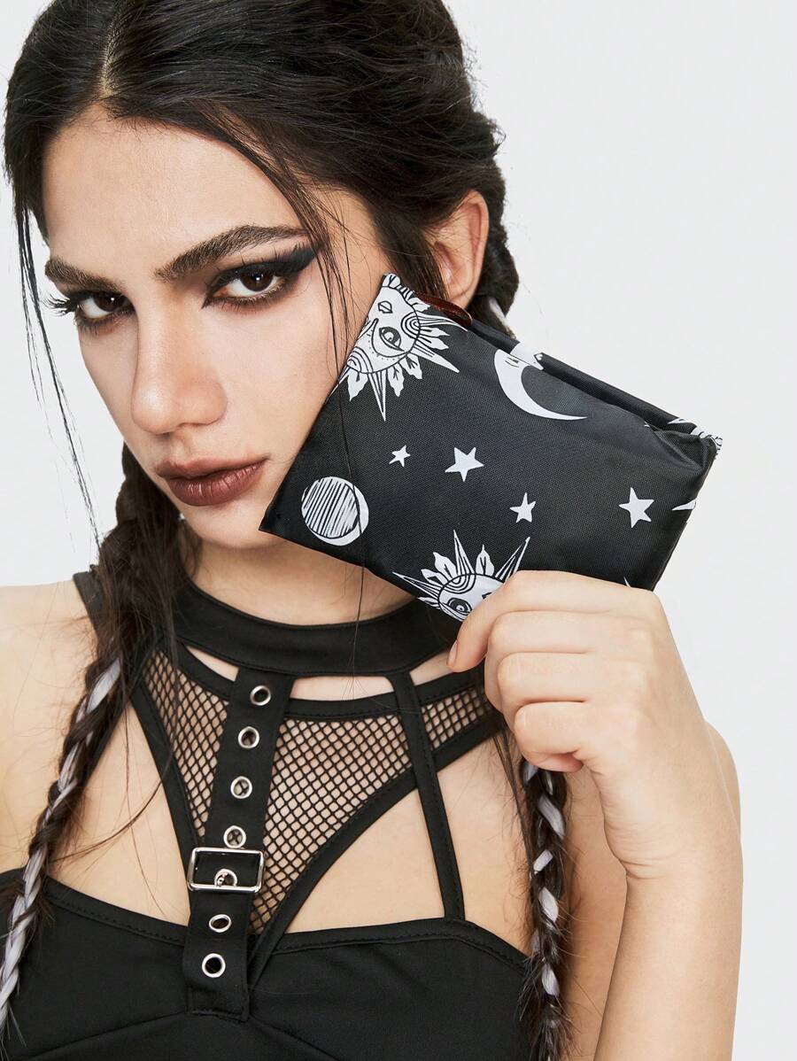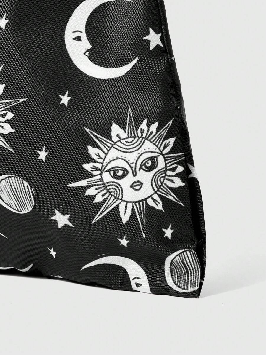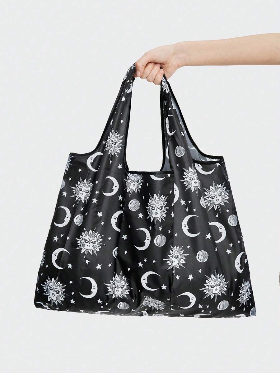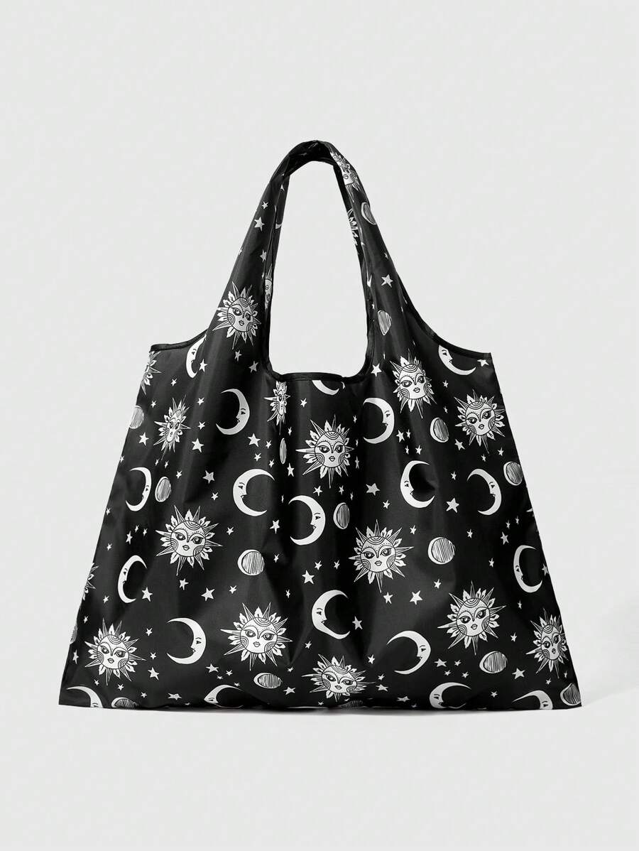 Fairycore Fashionable Dark Star & Moon Full Version Printed Pattern Storage Bag With Large Capacity, Foldable Tote Bag For Shopping
