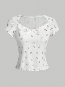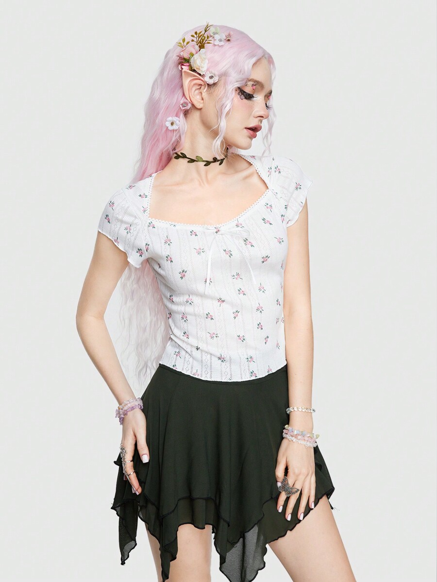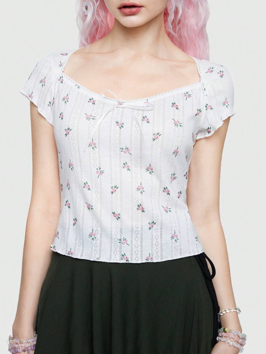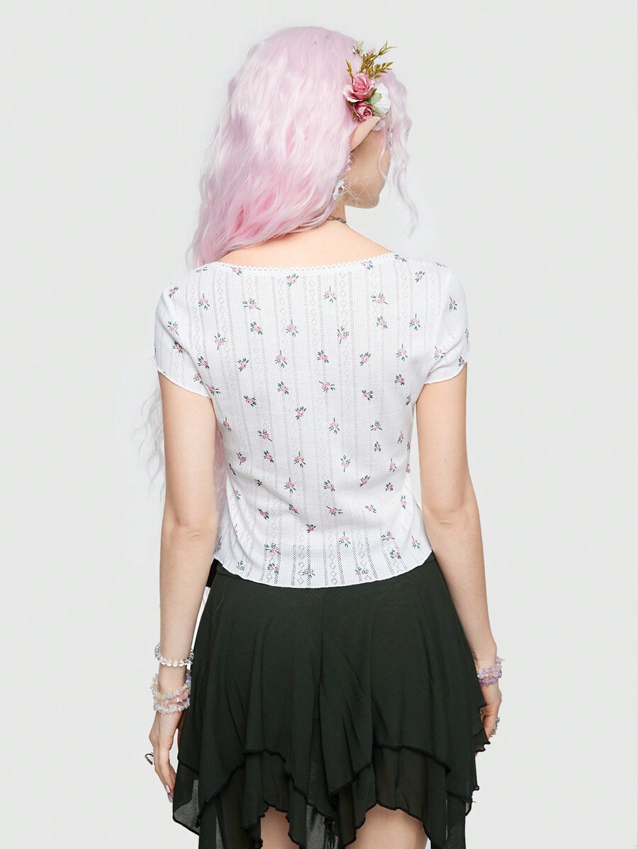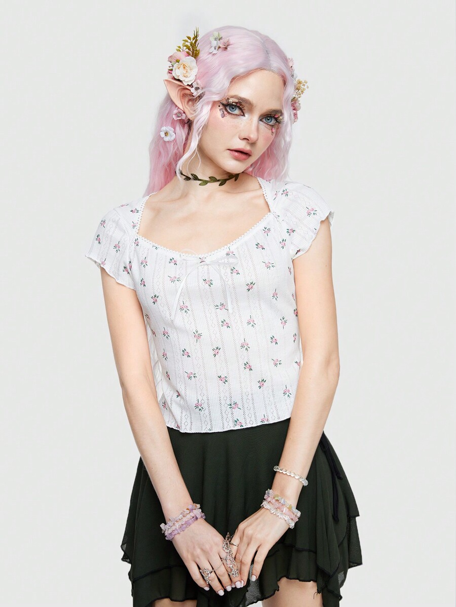 Fairycore Floral Lace Up Short Sleeve T-Shirt With Lace Trims