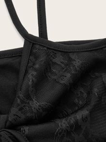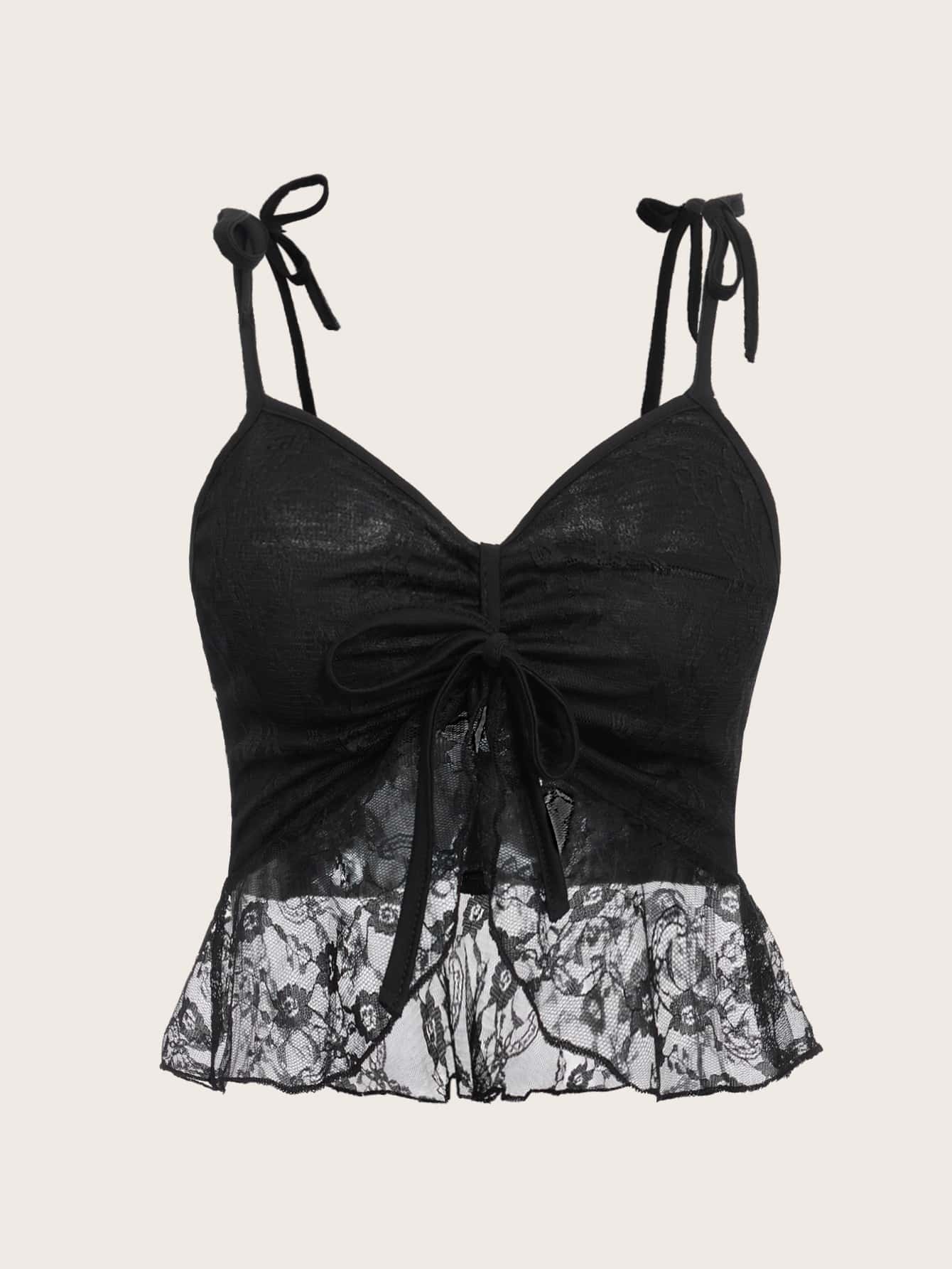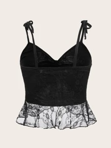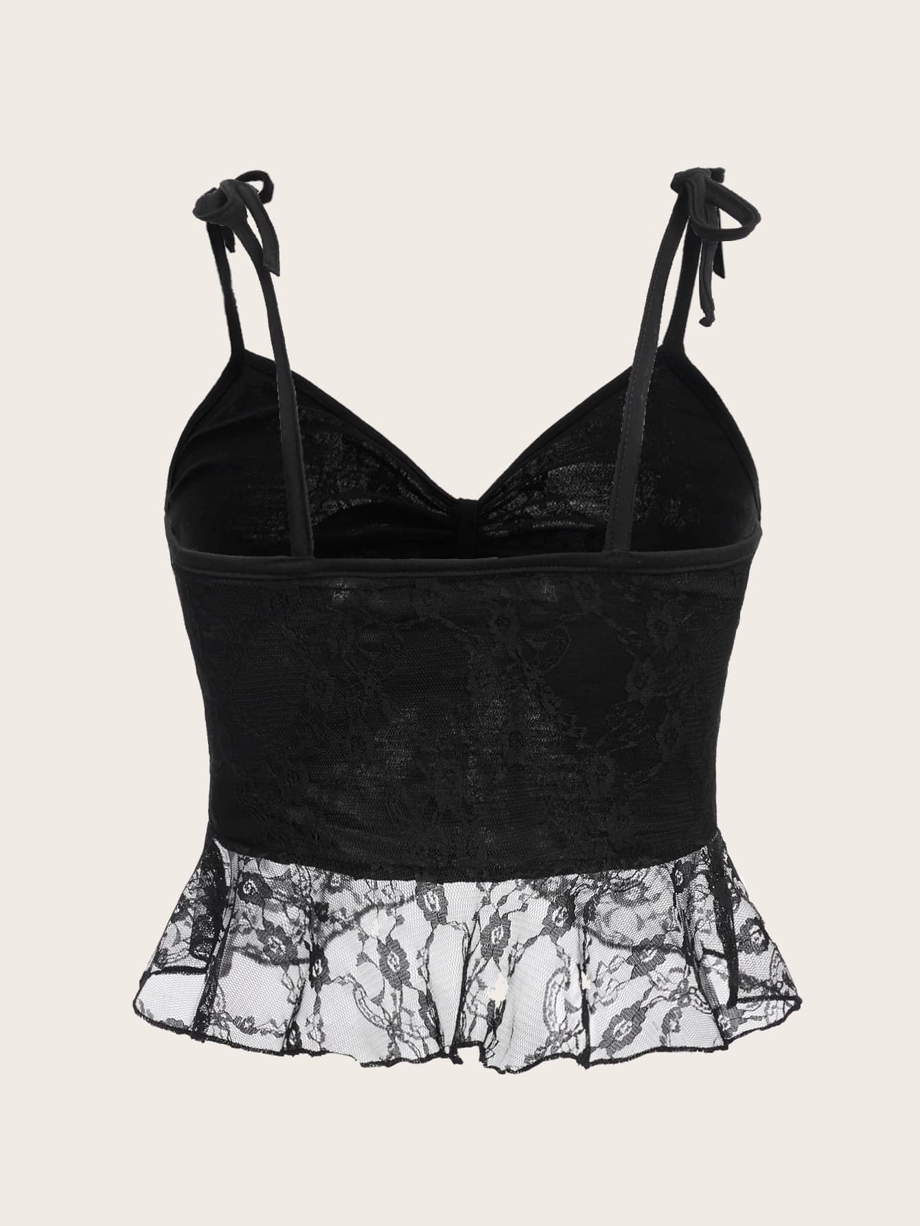 Fairycore Floral Mesh Ruffle Hem Tie Shoulder Cami Top