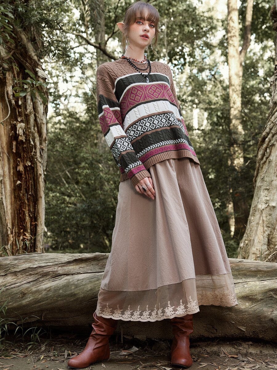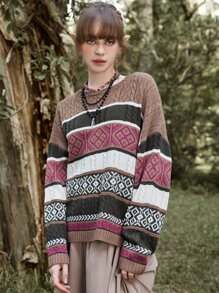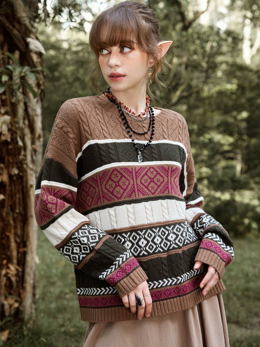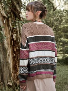 Hippie Geo Pattern Colorblock Cable Knit Sweater