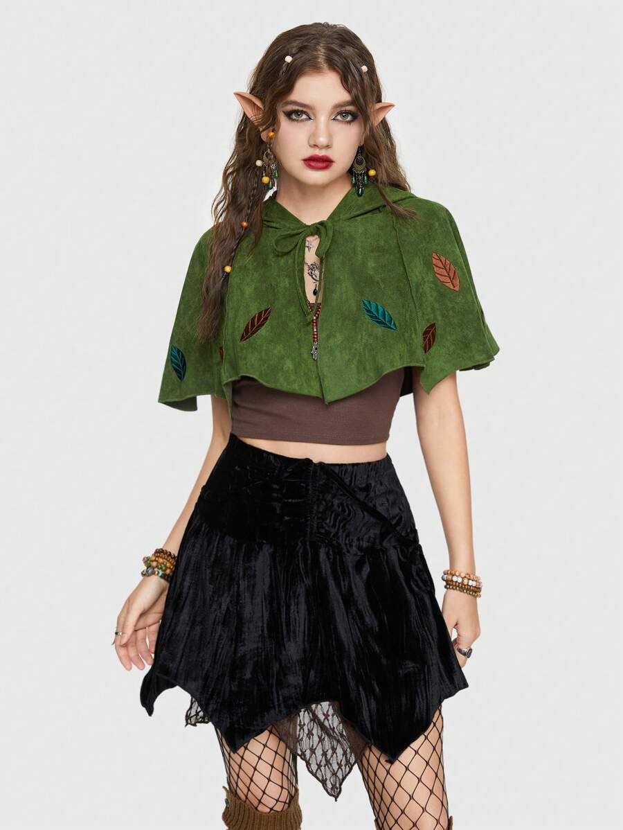 Fairycore Leaf Embroidery Crop Costume Hooded Cape