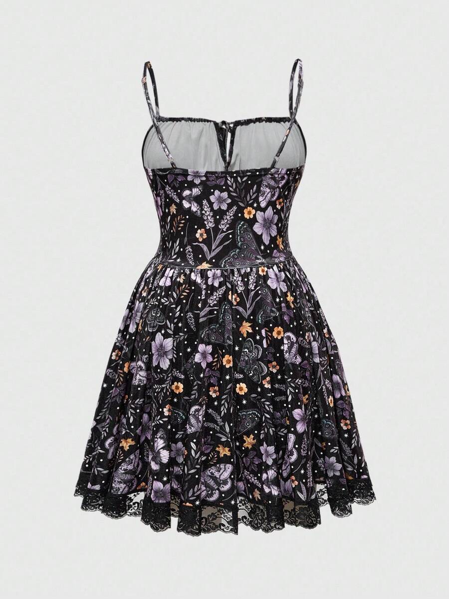 Fairycore Fairycore Moth & Flower Print Lace Trim Velvet Plus Size Dress
