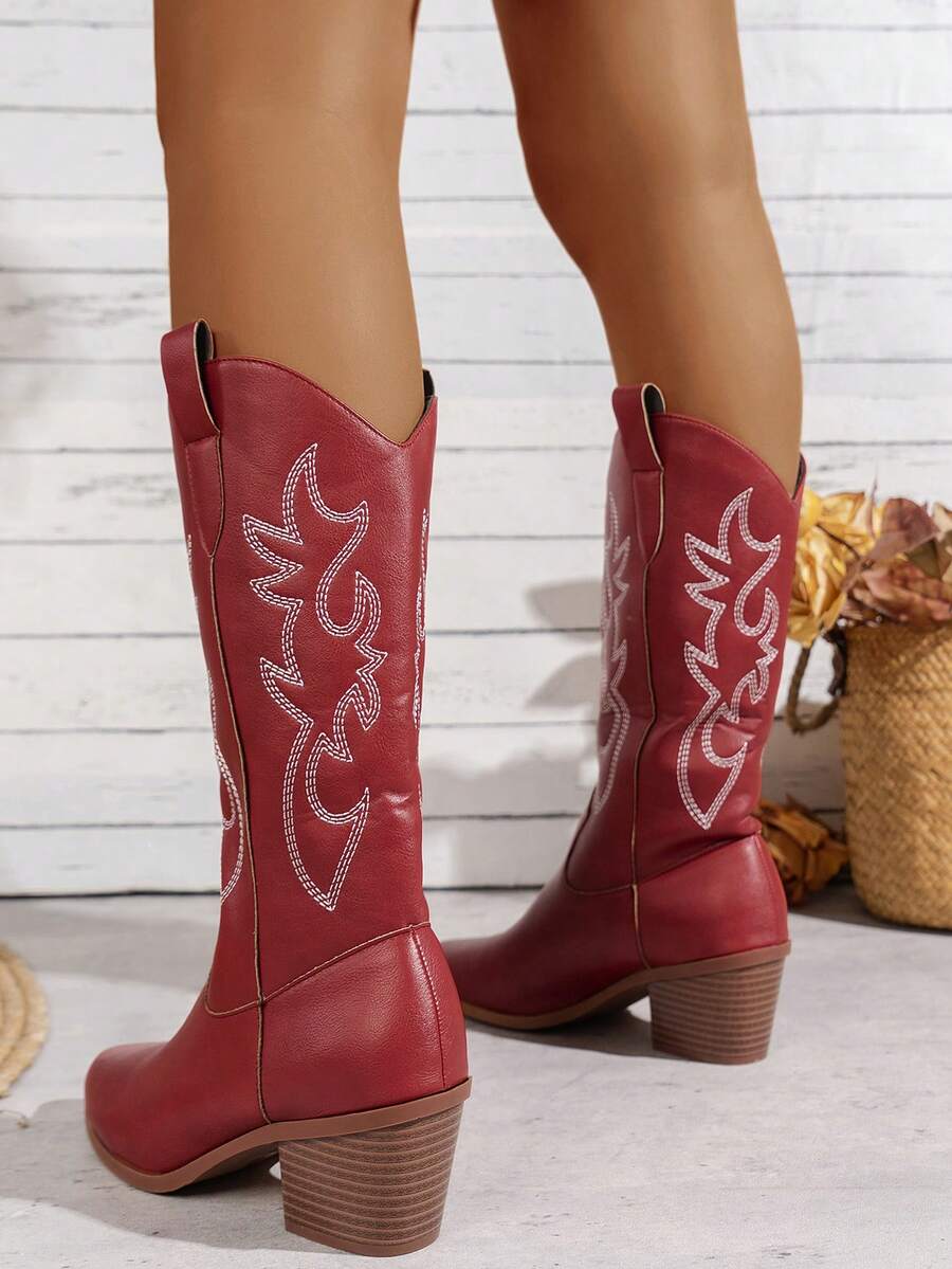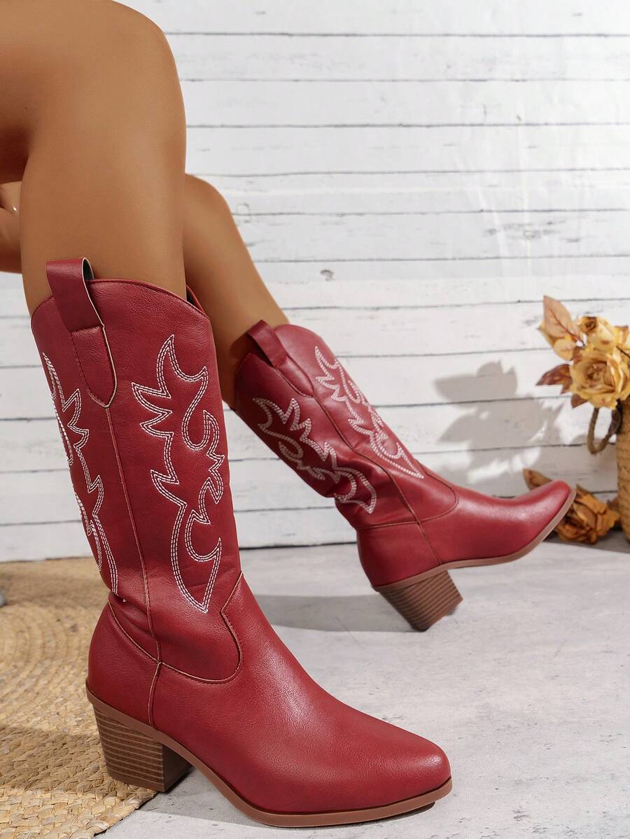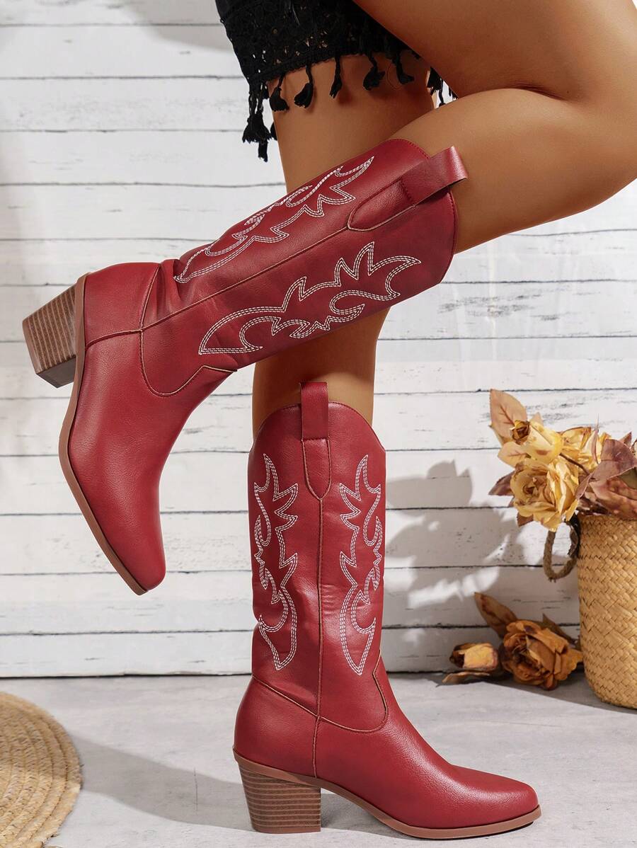 Fairycore New Arrivals 2024 Spring/Autumn Plus Size Mid-Calf Pointed Toe Embroidered Chunky Heel Western Riding Cowgirl Red Boots With Slip-On