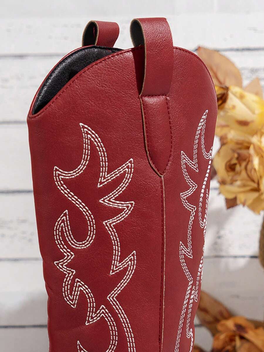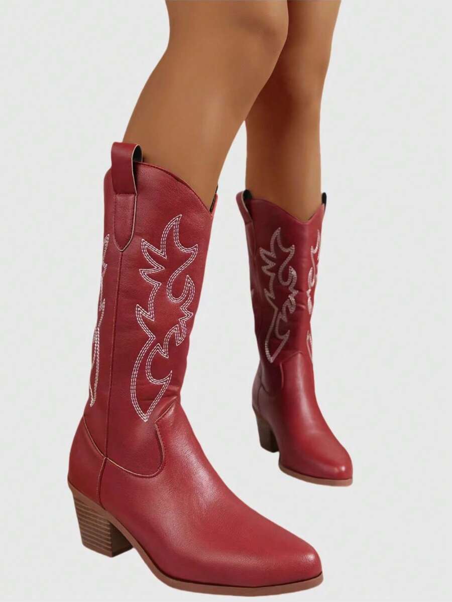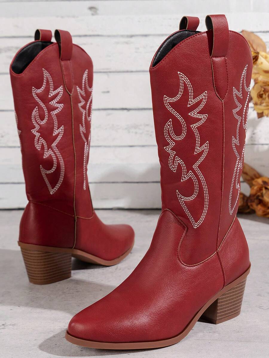 Fairycore New Arrivals 2024 Spring/Autumn Plus Size Mid-Calf Pointed Toe Embroidered Chunky Heel Western Riding Cowgirl Red Boots With Slip-On