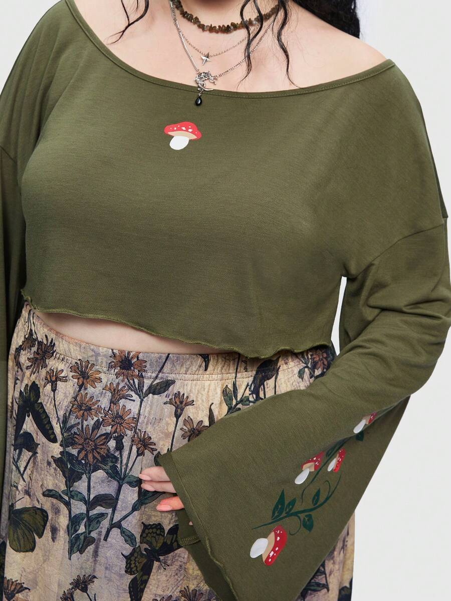 Fairycore Plus Mushroom Print Drop Shoulder Tee