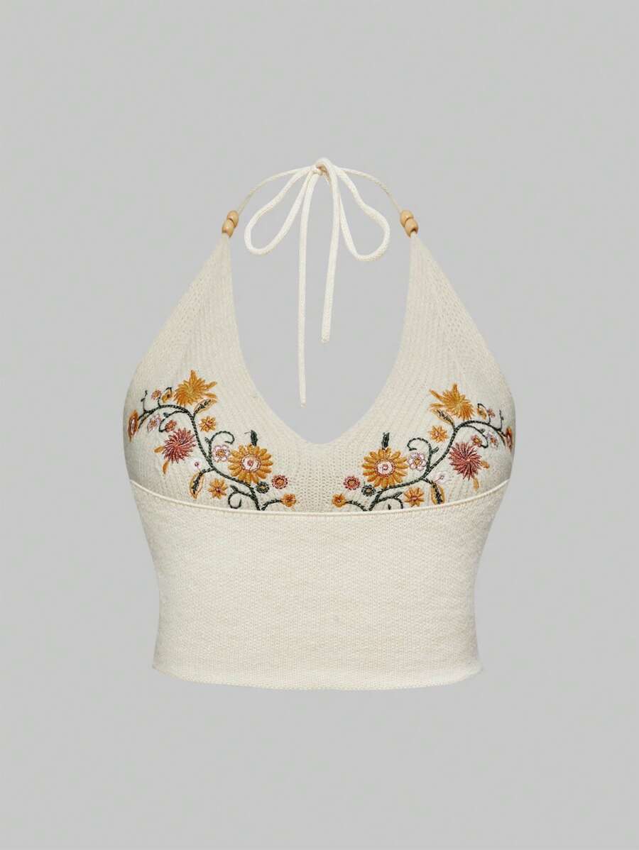 Fairycore Plus Size Women's Floral Embroidery Halter Neck Knit Pullover Top