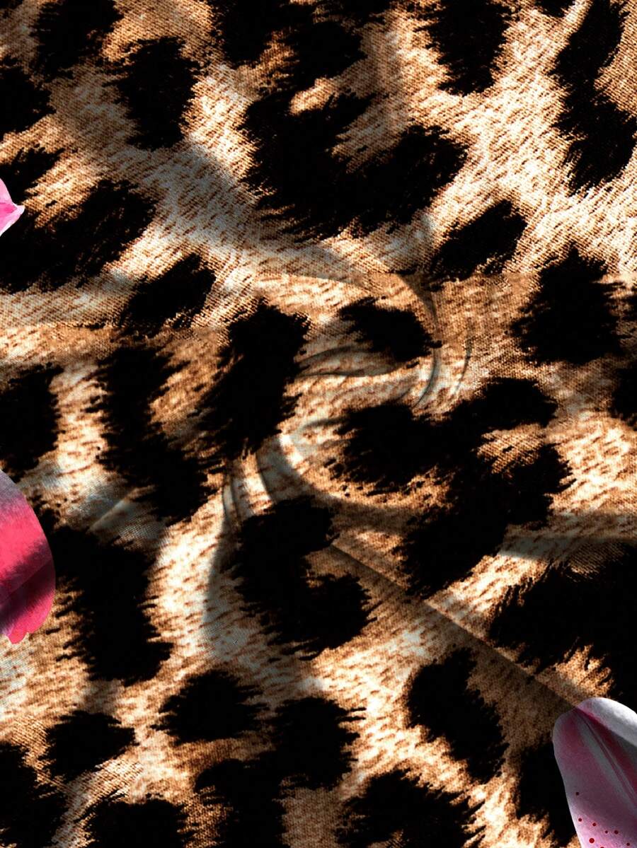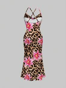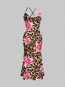 Fairycore Sexy Vacation Leopard Print & Hibiscus Floral Mermaid Hem Bodycon Spaghetti Strap Dress For Women