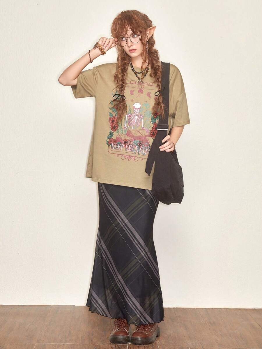 Fairycore Skeleton & Letter Graphic Drop Shoulder Tee