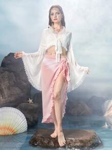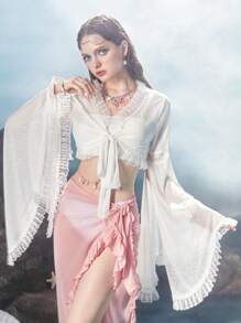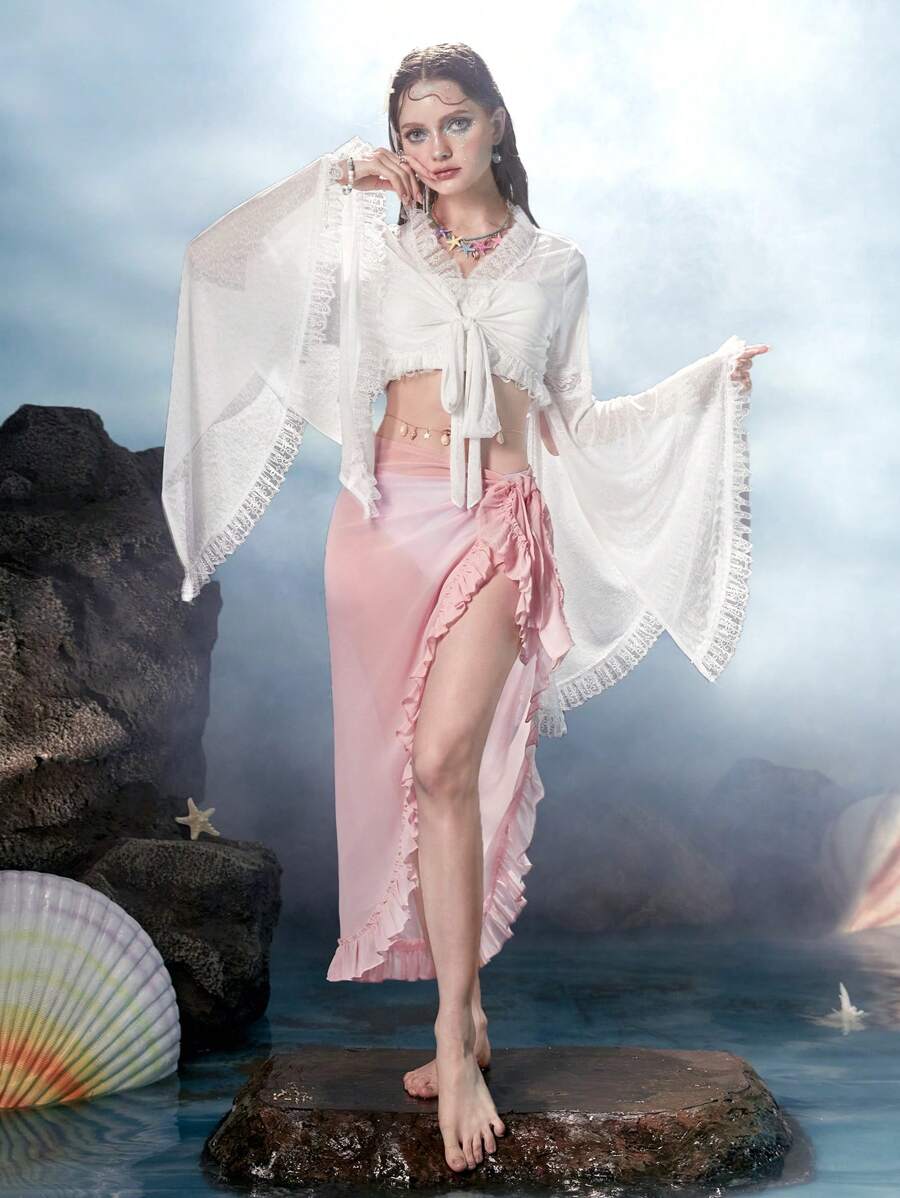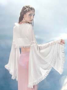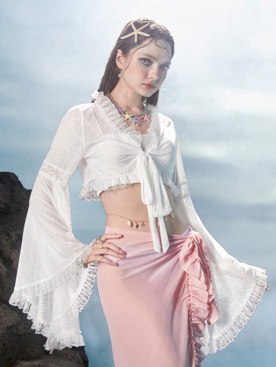 Fairycore Mermaid Solid Tie Front Lace Trim Flounce Sleeve Crop Top