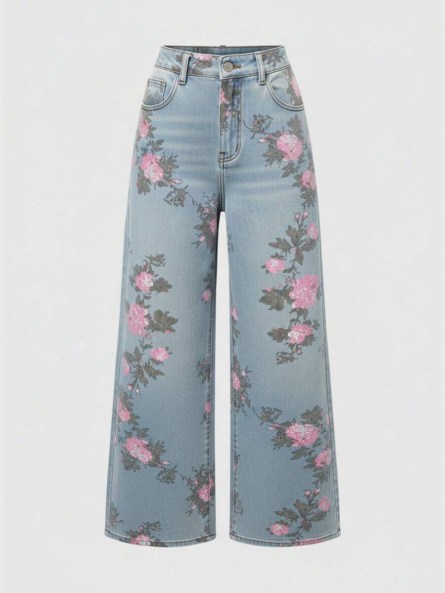 Fairycore Spring/Summer Flower Vintage Floral Print Washed Loose Wide Leg Jeans For Women