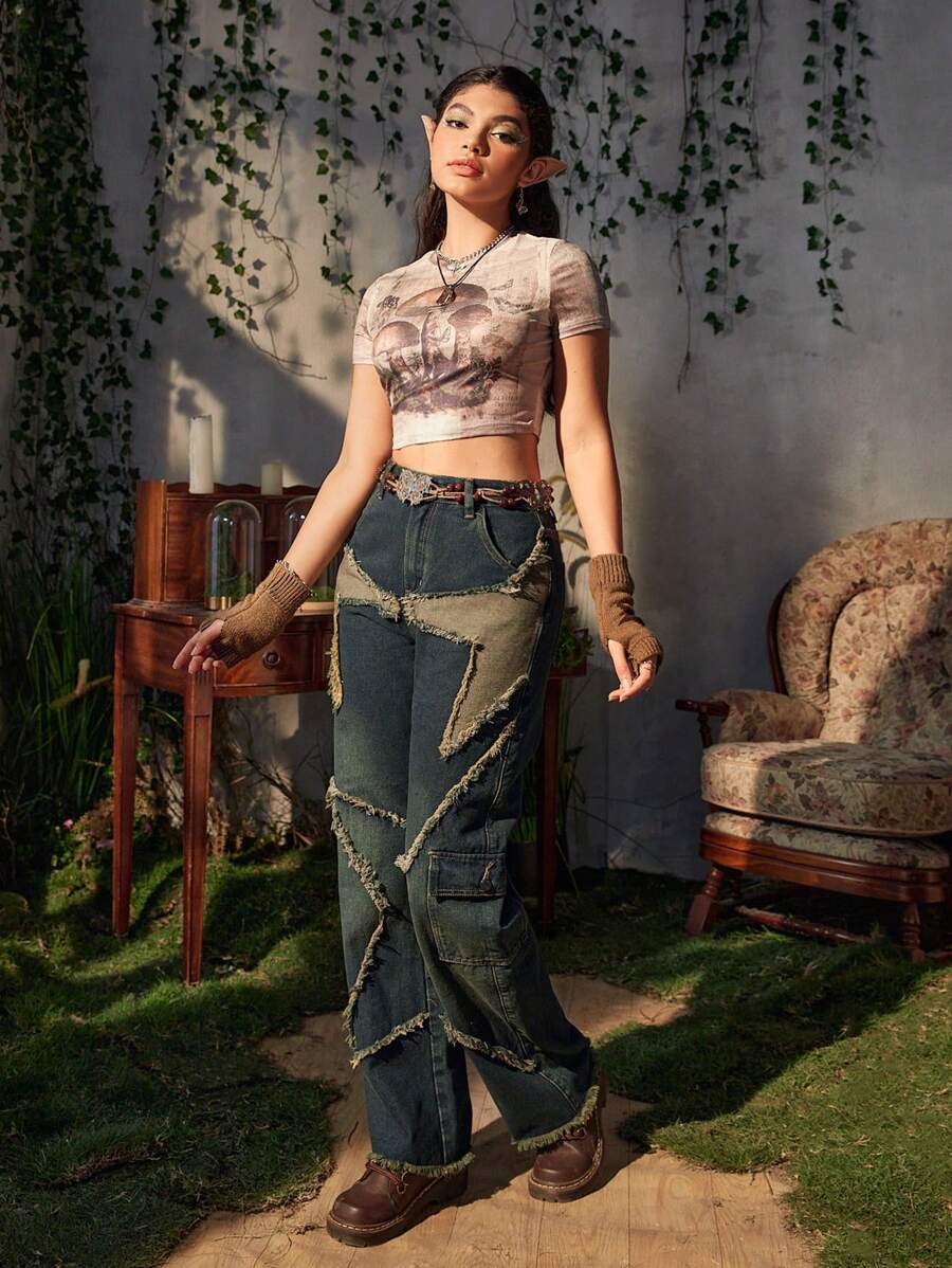 Fairycore Star Design Colorblock Raw Trim Straight Leg Jeans, School