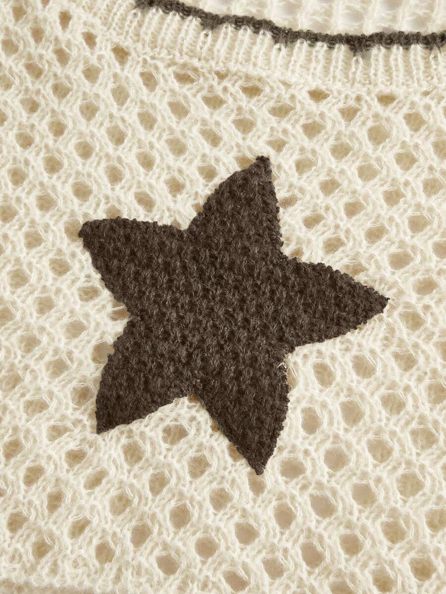 Fairycore Star Pattern Open Knit Drop Shoulder Super Crop Sweater