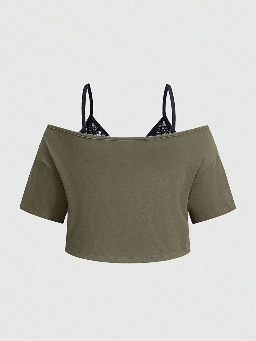 Fairycore Women 2 In 1 Lace Spaghetti Strap T-Shirt With Frog And Mushroom Print