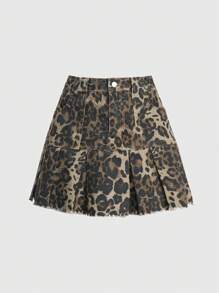 Fairycore Women Denim Leopard Print Pleated Fashionable Fringed Hem Mini Skirt, School
