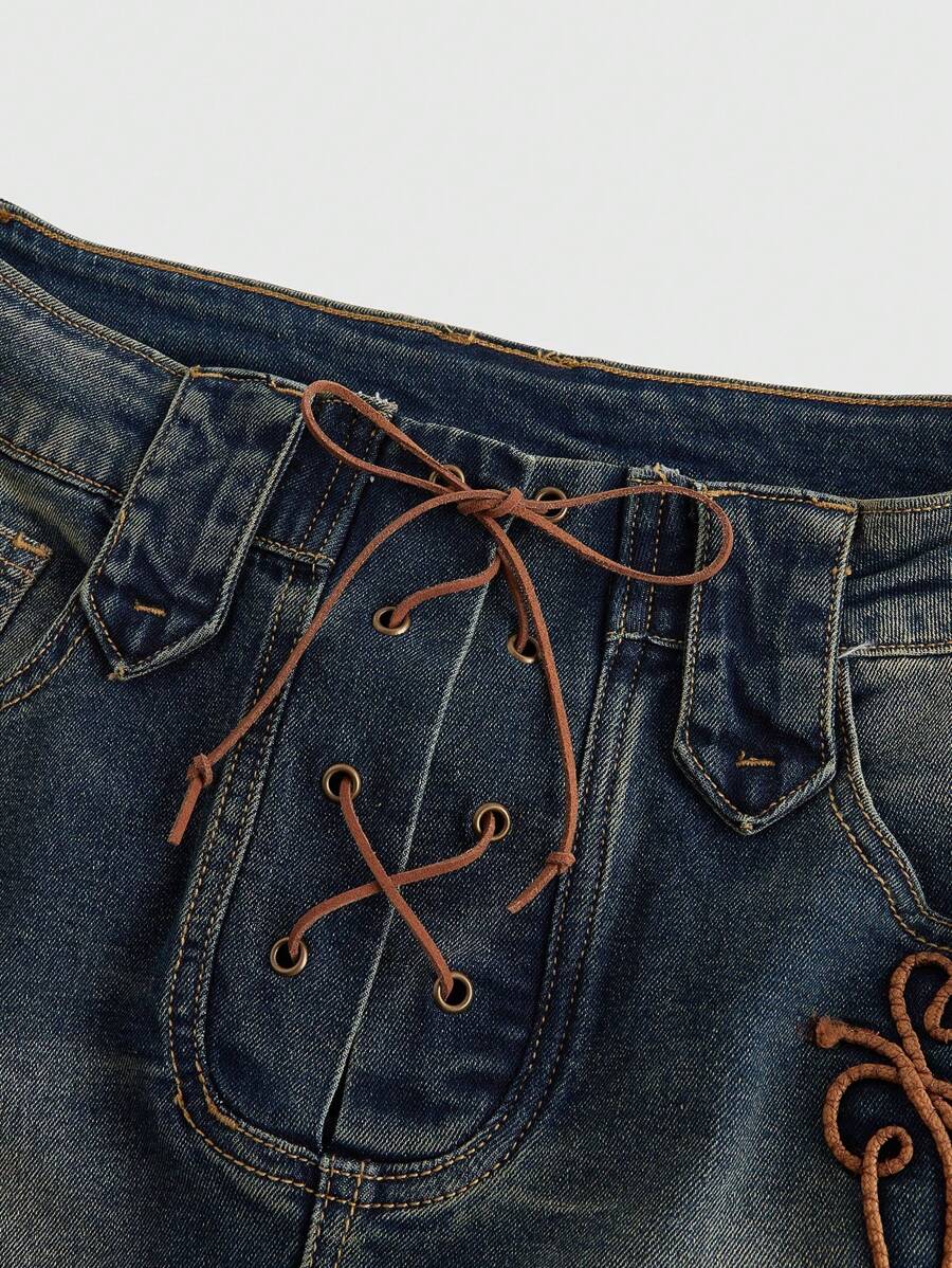 Women Fairycore Drawstring Embroidered Denim Long Skirt