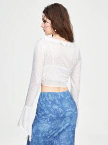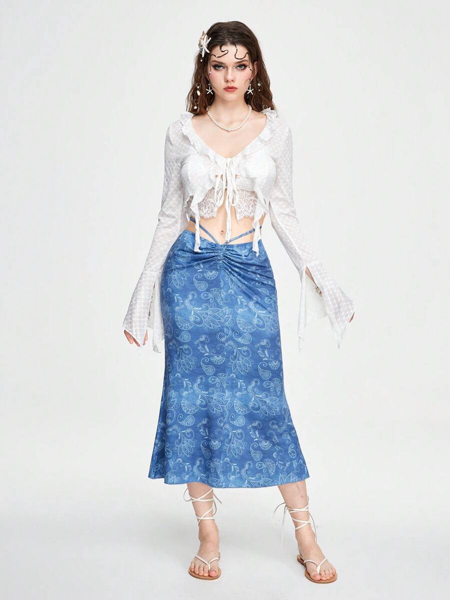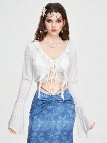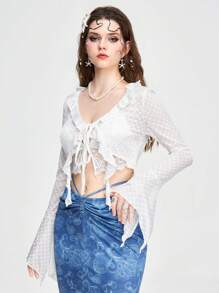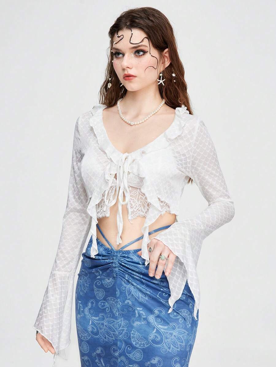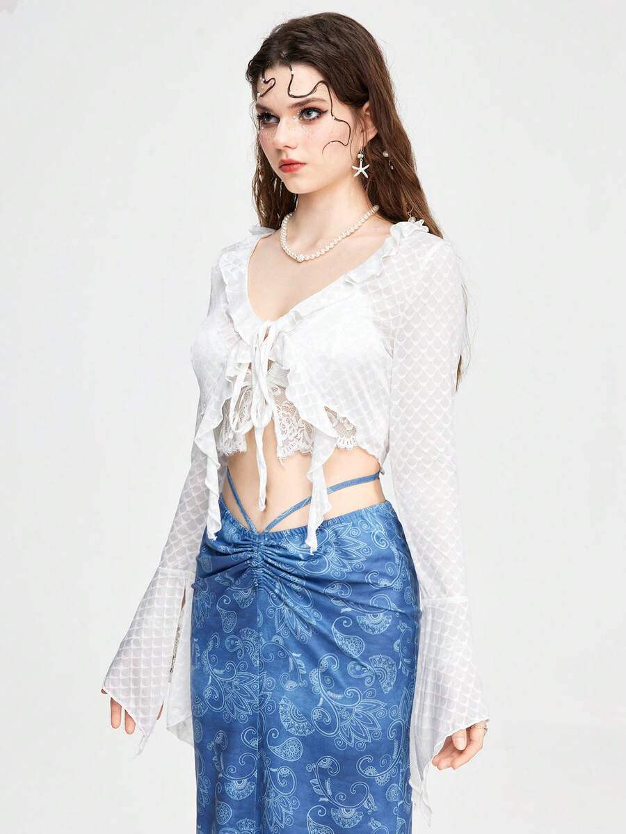 Fairycore Women Mermaid Seashell Fabric Ruffle Trim Tie-Front Blouse